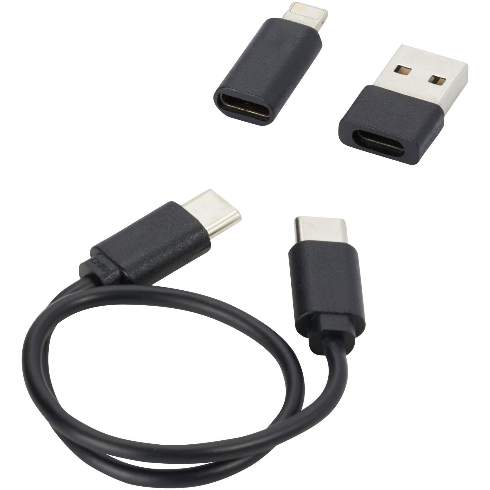 Modulares Datenübertragungs- und Ladekabel aus recyceltem Kunststoff, geliefert in einer eleganten Aufbewahrungsbox. Das Kabel bietet mehrere Ladelösungen: Typ-C- und USB-A-Eingang und Typ-C / iOS / Micro-USB-Ausgang. Dank all dieser Adapter und Anschlüsse können Sie mit diesem Kabel die meisten Smartphones, Kameras, Powerbanks, Ohrhörer usw. aufladen. Das Kabel hat eine maximale Ausgangsleistung von 2 A. Sie verfügt über einen Auswurfstift, der immer dann nützlich ist, wenn Sie die SIM-Karte Ihres Telefons herausnehmen müssen. Die Aufbewahrungsbox bietet außerdem Platz für eine Micro-SD-Speicherkarte sowie eine Nano-SIM-Karte und ist damit das perfekte Reisezubehör. Länge des Kabels: 28 cm. Wird in einem Umschlag aus 100% recyceltem Kraftpapier geliefert.