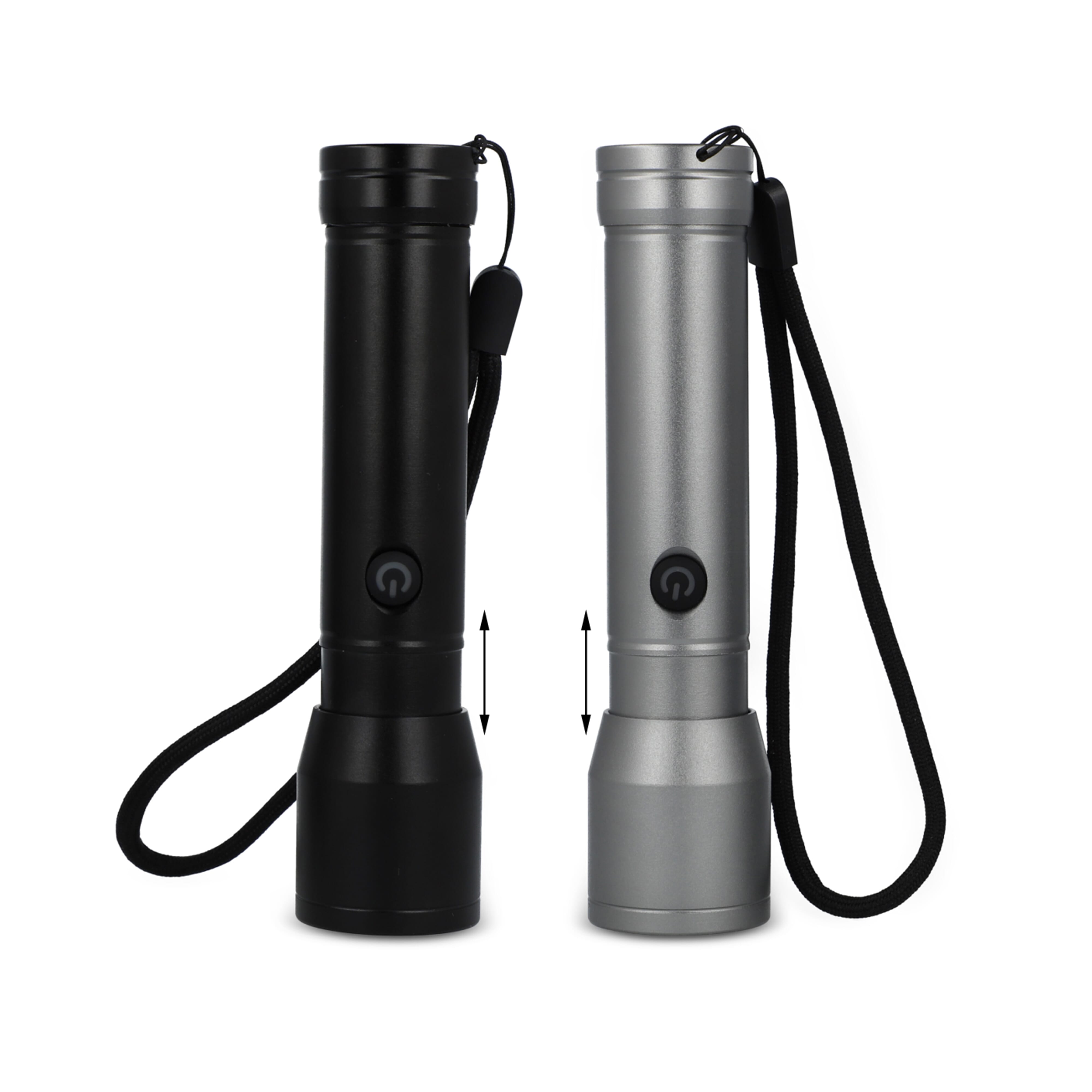 Wiederaufladbare Taschenlampe mit einem 1200-mAh-Akku und 5-W-LED-Licht mit 200 lm Helligkeit. Verfügt über eine Handschlaufe, mehrere Lichtmodi (hoch, niedrig und Blitz) und eine Zoomfunktion. Hergestellt aus recyceltem Aluminium und wasserdicht nach IPX4.