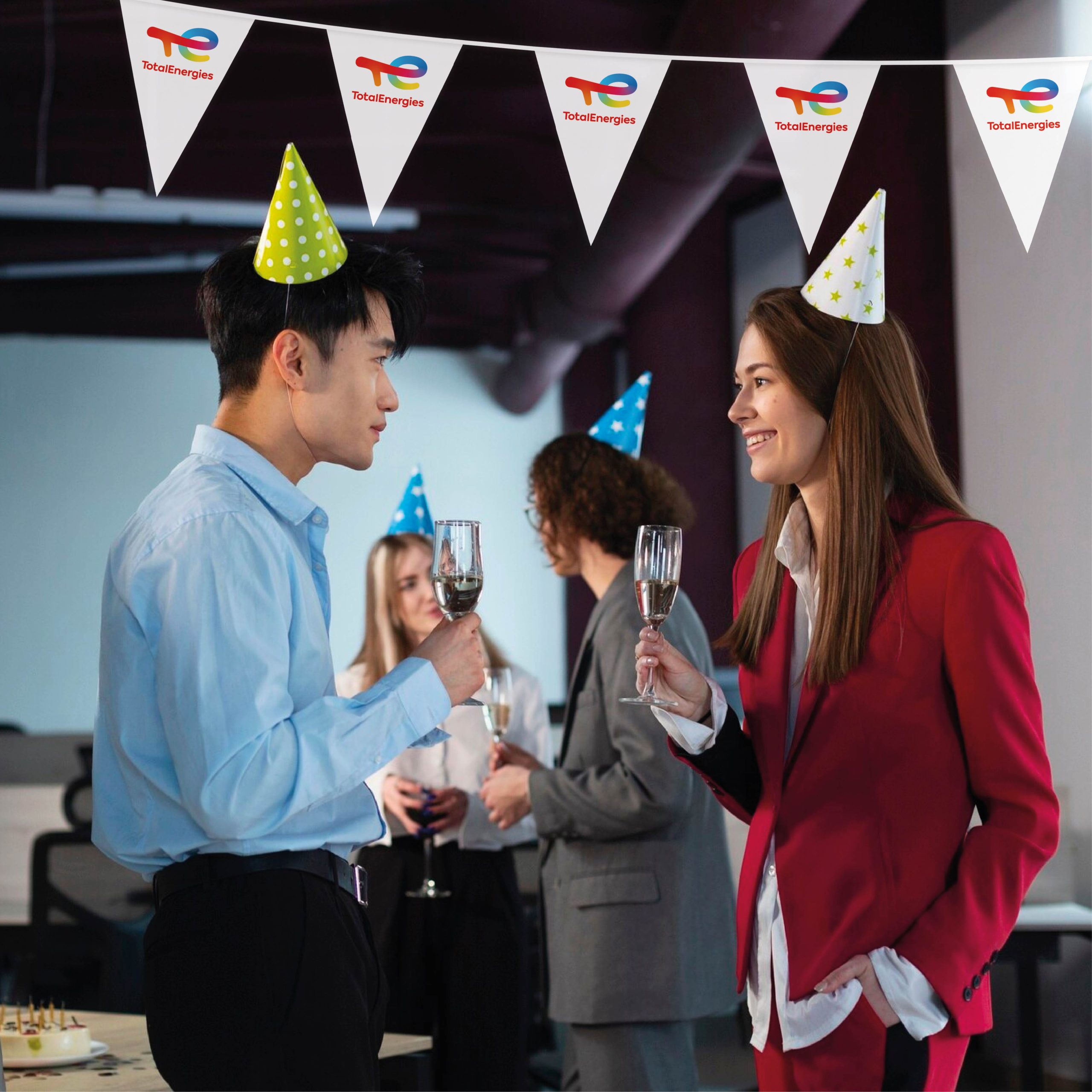 Diese bedruckten Wimpelketten aus MC-Papier eignen sich am besten für die Innendekoration. Wir produzieren auch Ketten aus schwer entflammbarem Papier Solaris Flam und aus synthetischem Papier Yupo. (Yupo ist je nach Wetterlage für den Außeneinsatz geeignet).