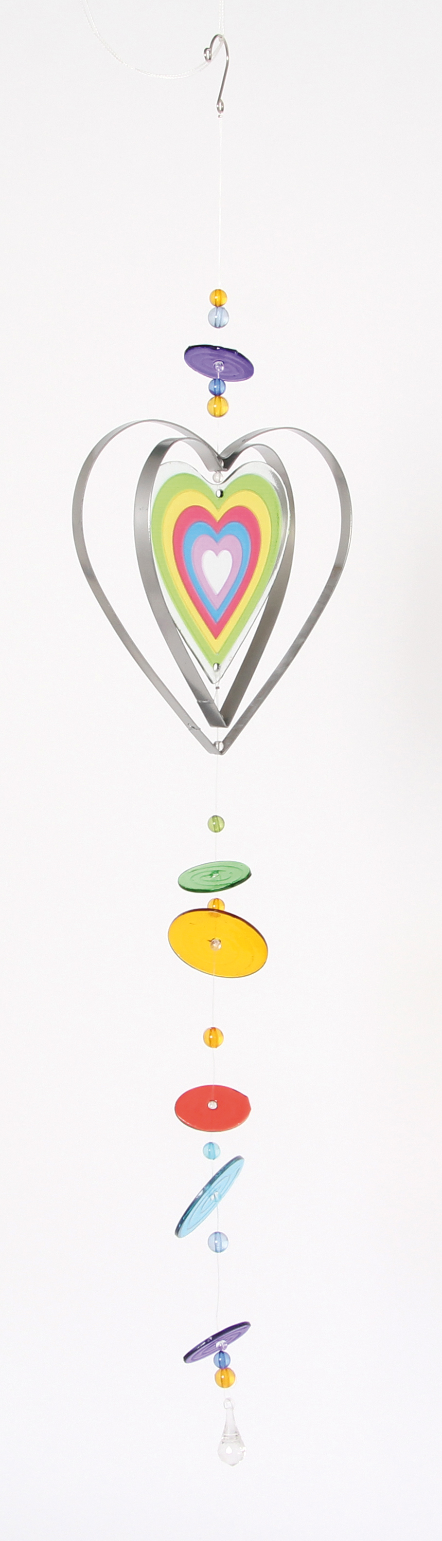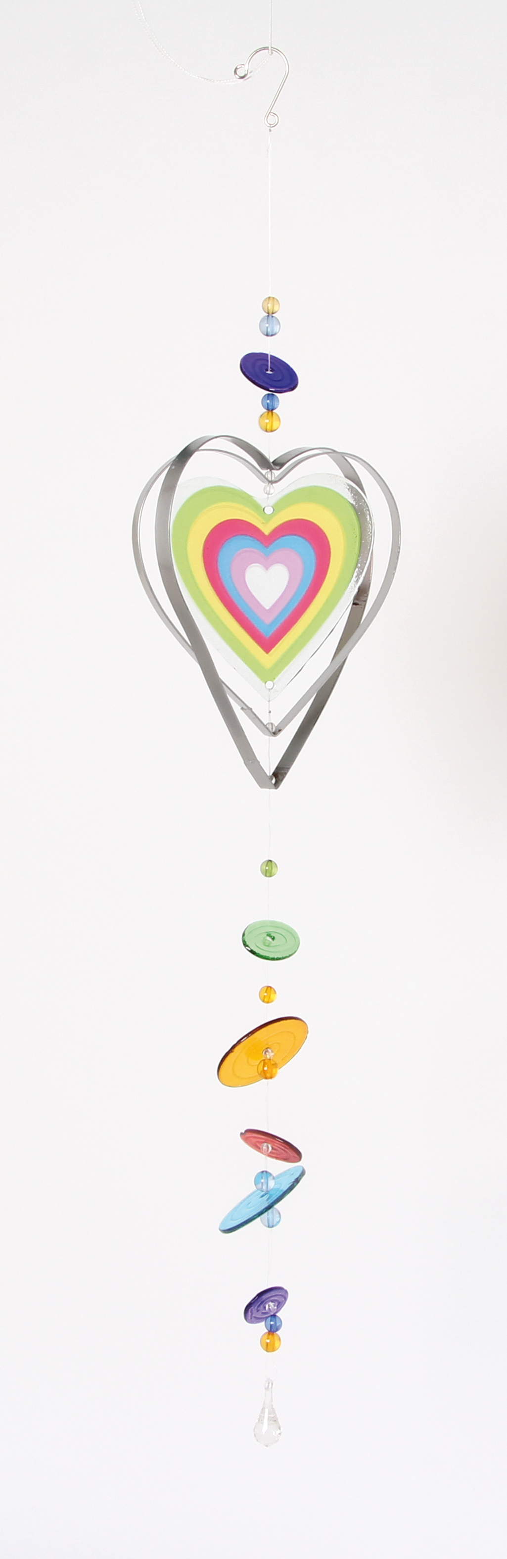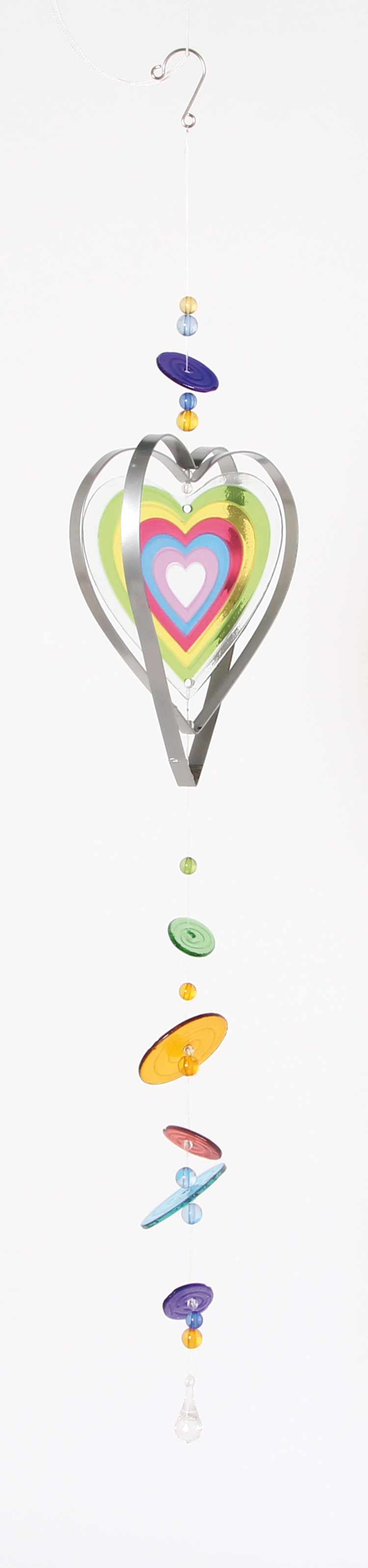 Zeitloser Deko-Hänger aus Glas und Metall. An der hochwertige Glasform, kombiniert mit glänzenden Metallkonturen hängen bunte Glasscheiben die sich sanft im Wind wiegen. Zwei verschiedene Designs sortiert: Herz und Blume