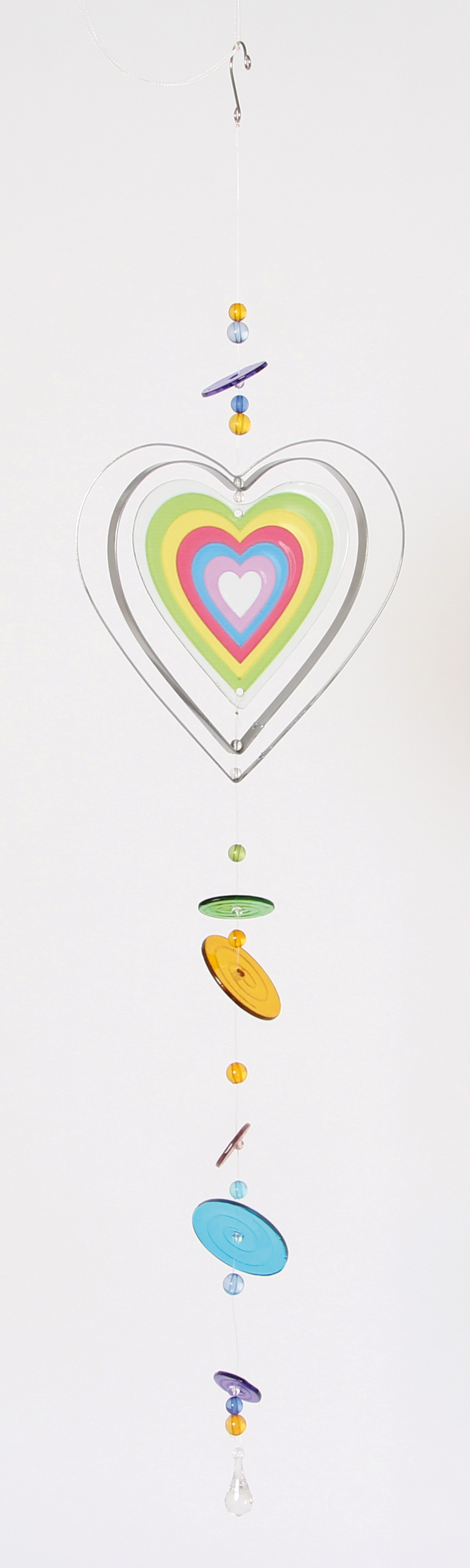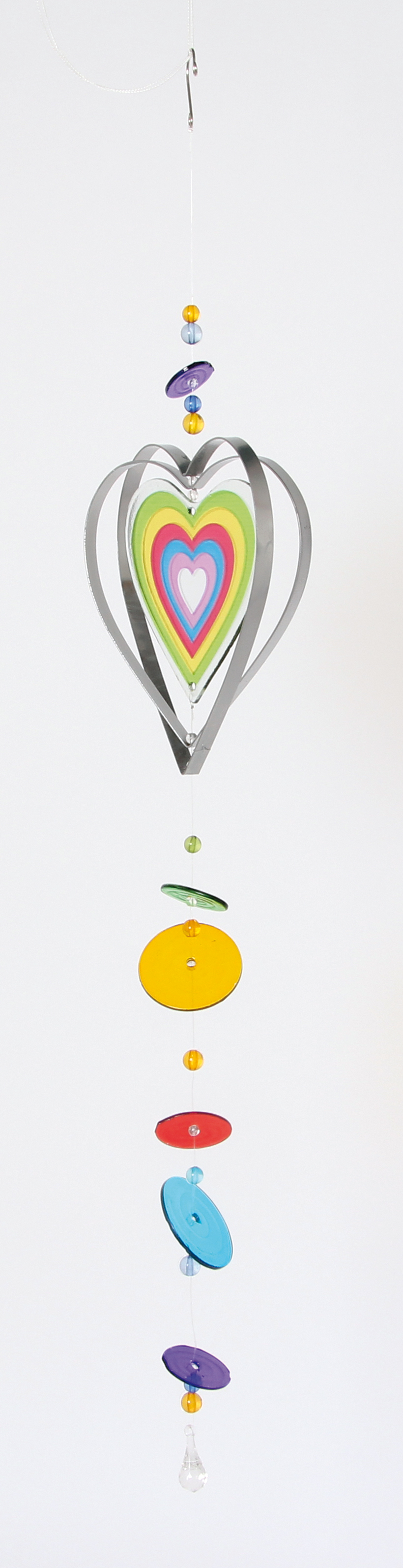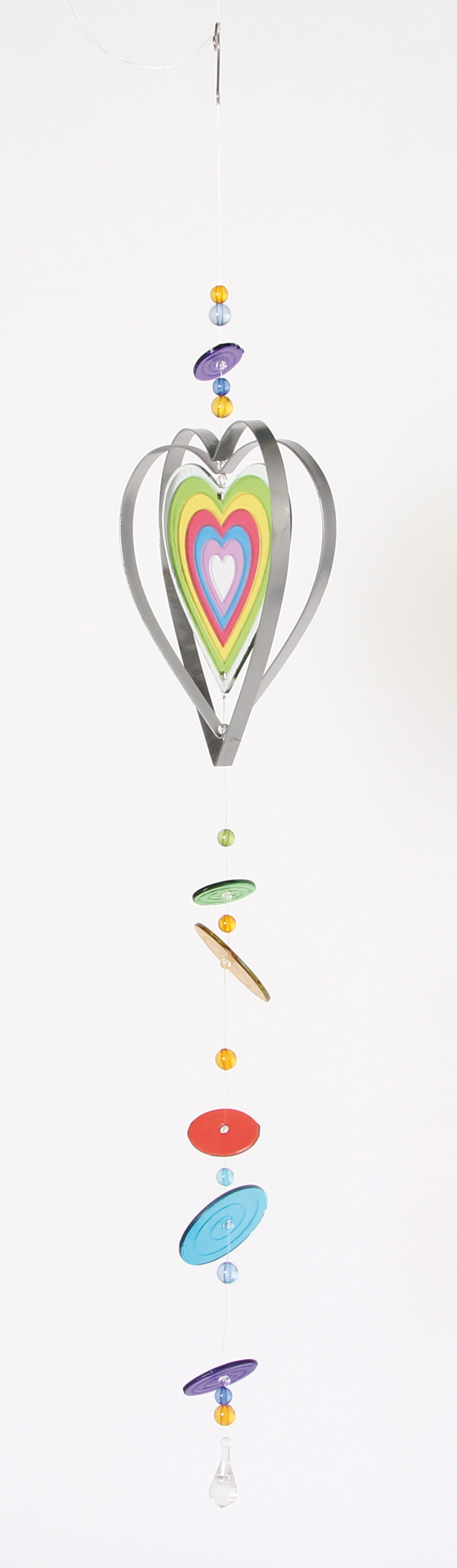 Zeitloser Deko-Hänger aus Glas und Metall. An der hochwertige Glasform, kombiniert mit glänzenden Metallkonturen hängen bunte Glasscheiben die sich sanft im Wind wiegen. Zwei verschiedene Designs sortiert: Herz und Blume