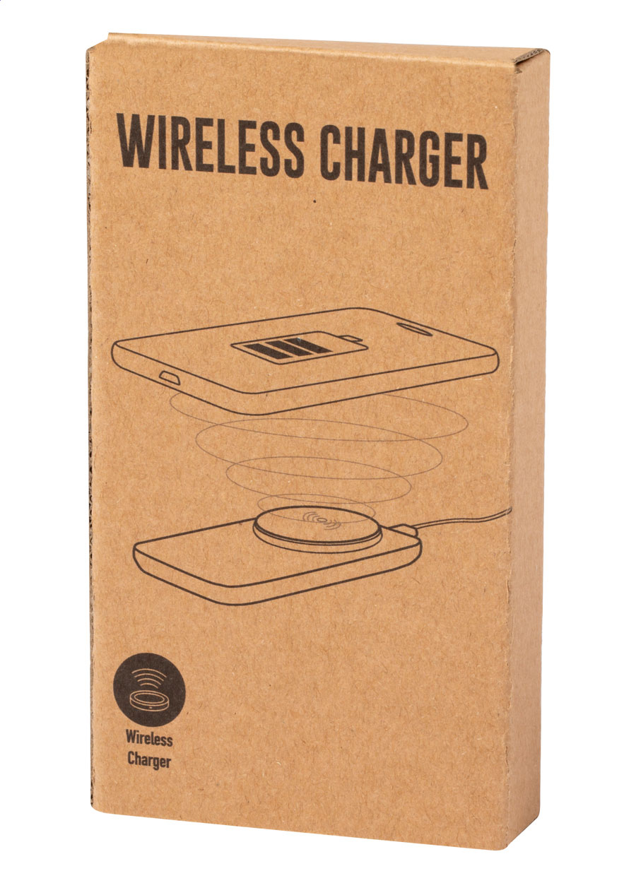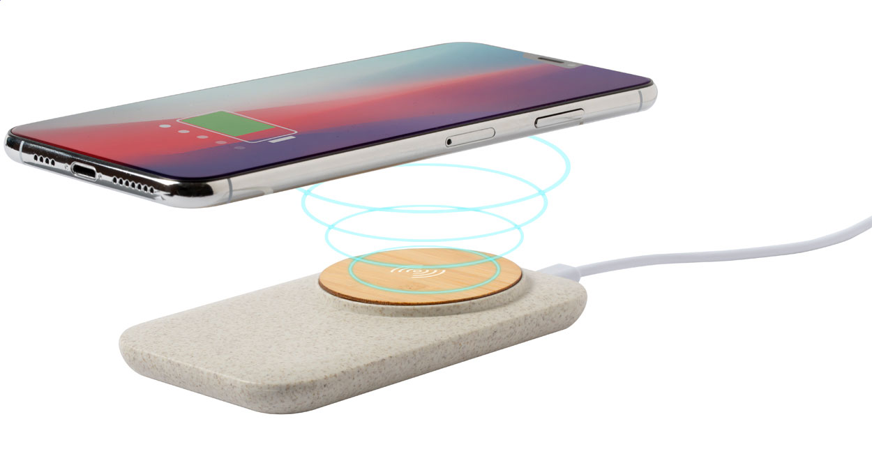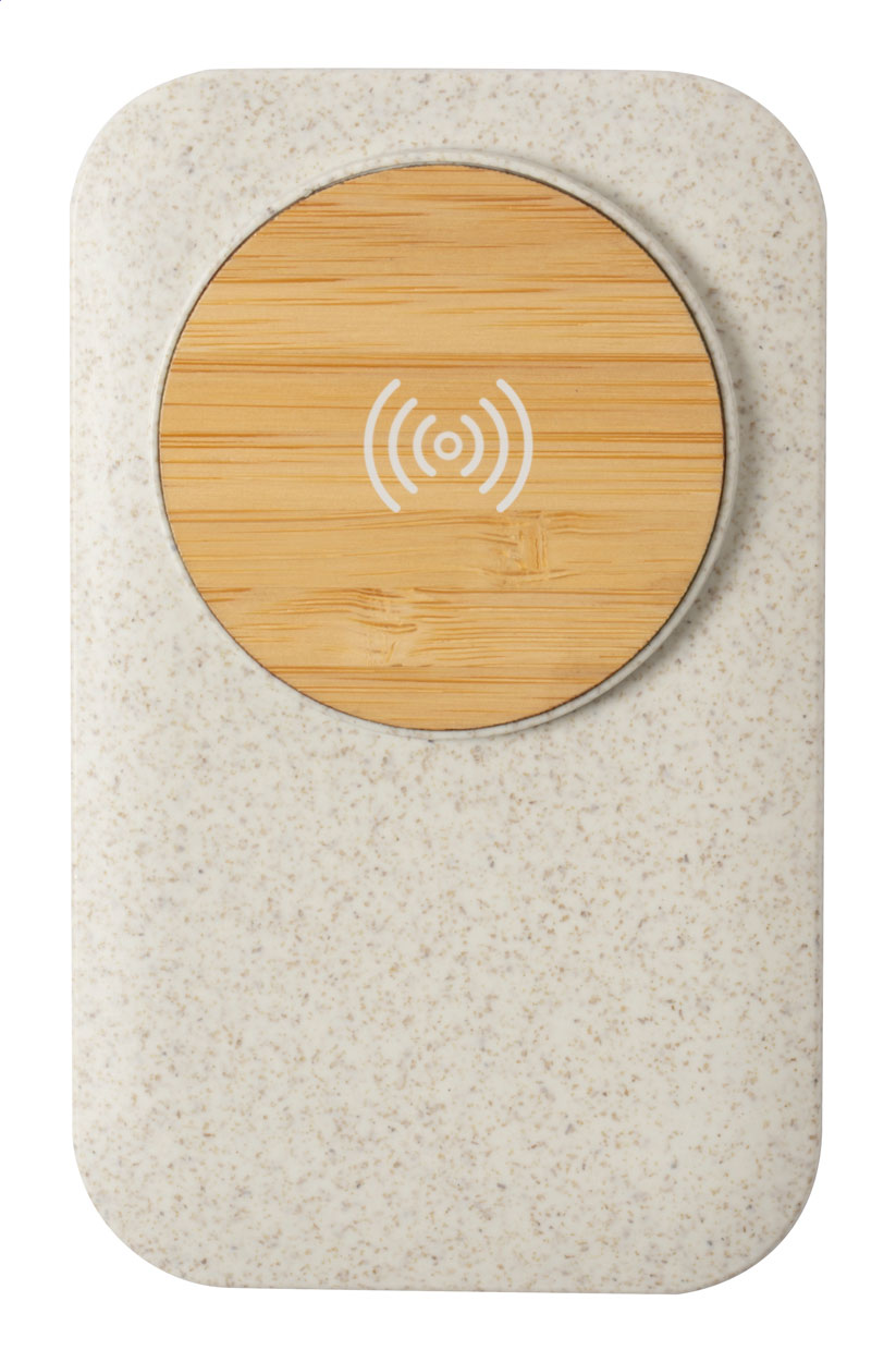 Wireless-Charger (5 W) aus ökologischem Weinzenstroh-Kunststoff mit Ladefläche aus Bambus. Inkl. USB-Ladekabel.