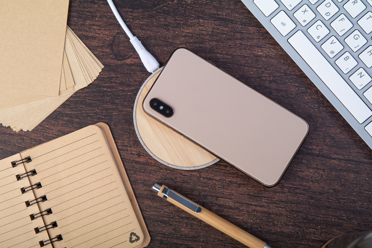 Wireless-Fastcharger (15 W) aus ökologischem Weizenstroh-Kunststoff und Bambusgehäuse. Inklusive USB-Ladekabel.