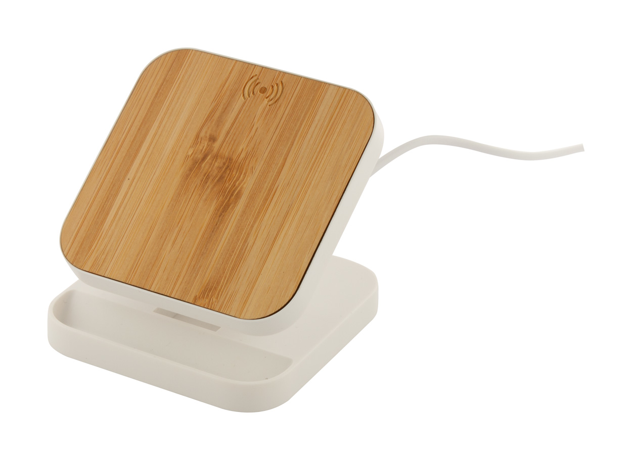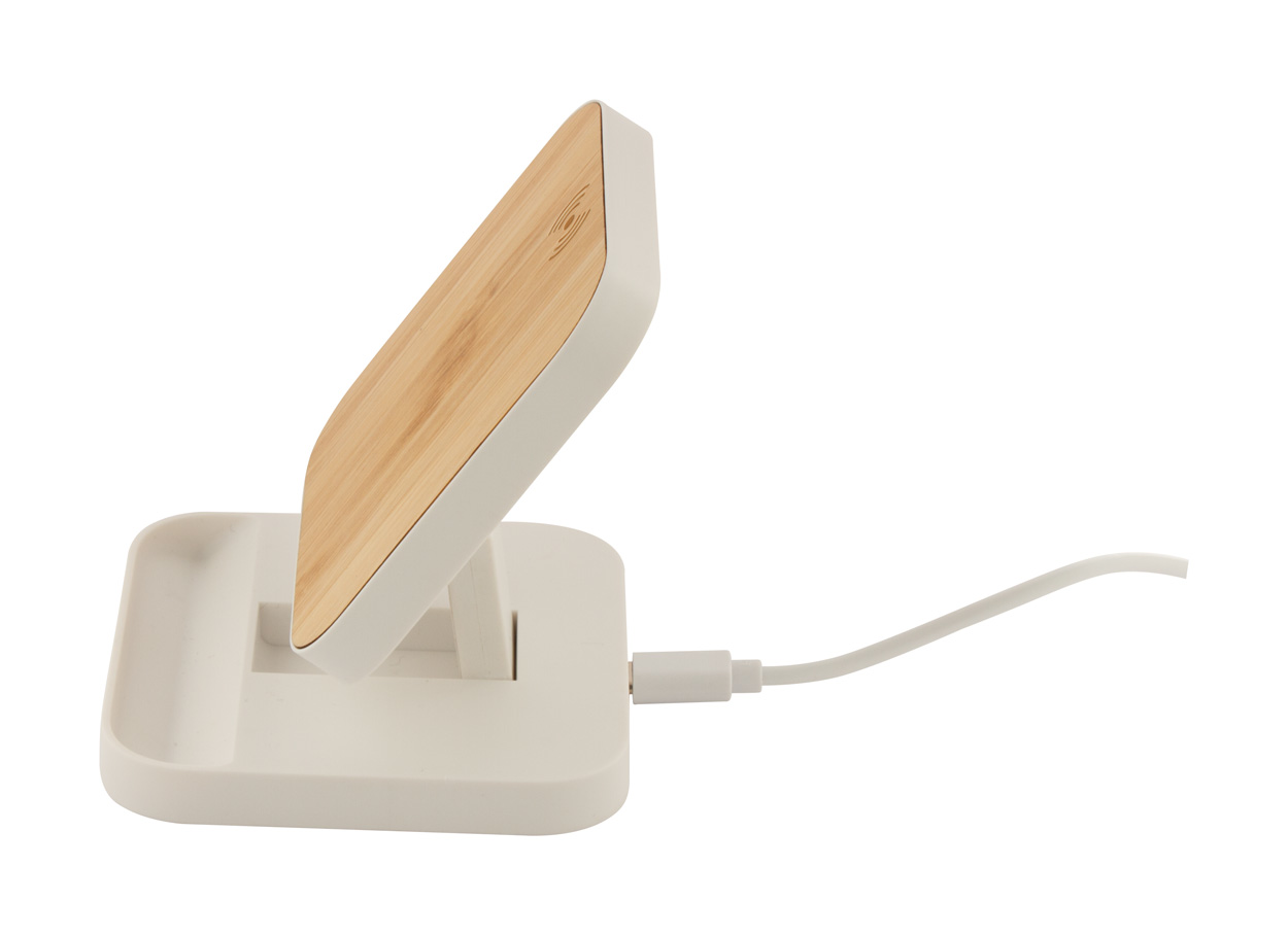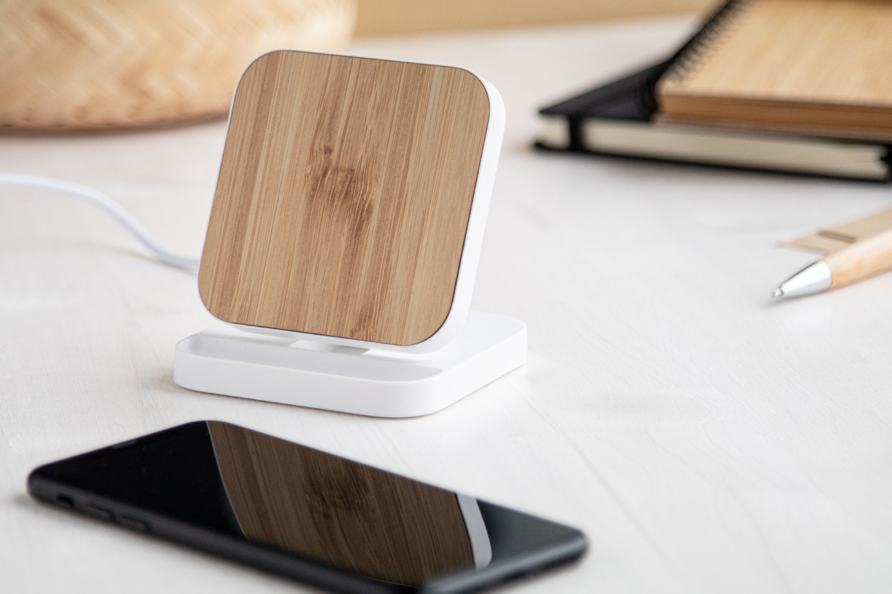 Handyhalter aus recyceltem ABS-Kunststoff mit bambusbeschichtetem integriertem Wireless-Fast-Charger (15 W). Inkl. USB-Ladekabel.