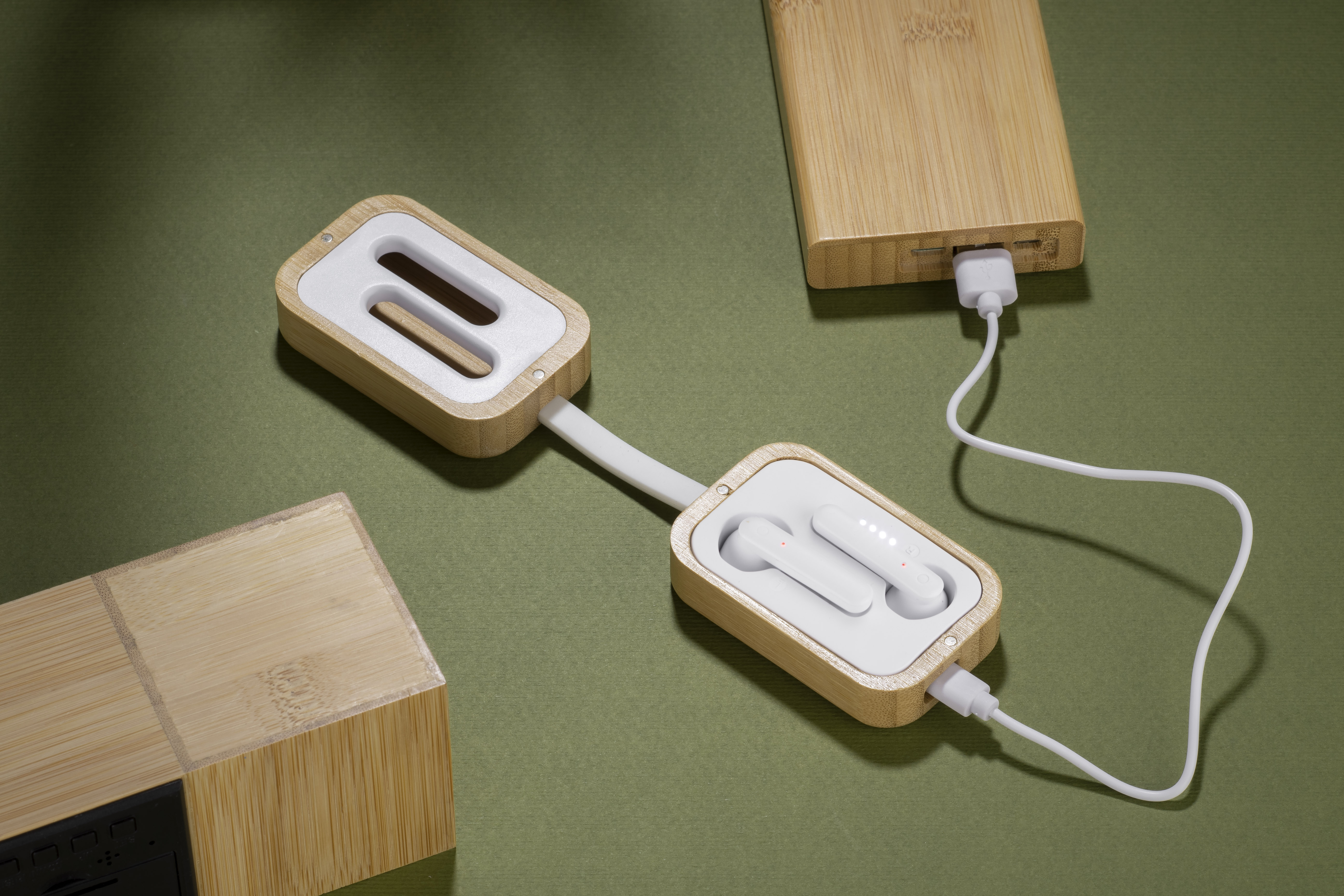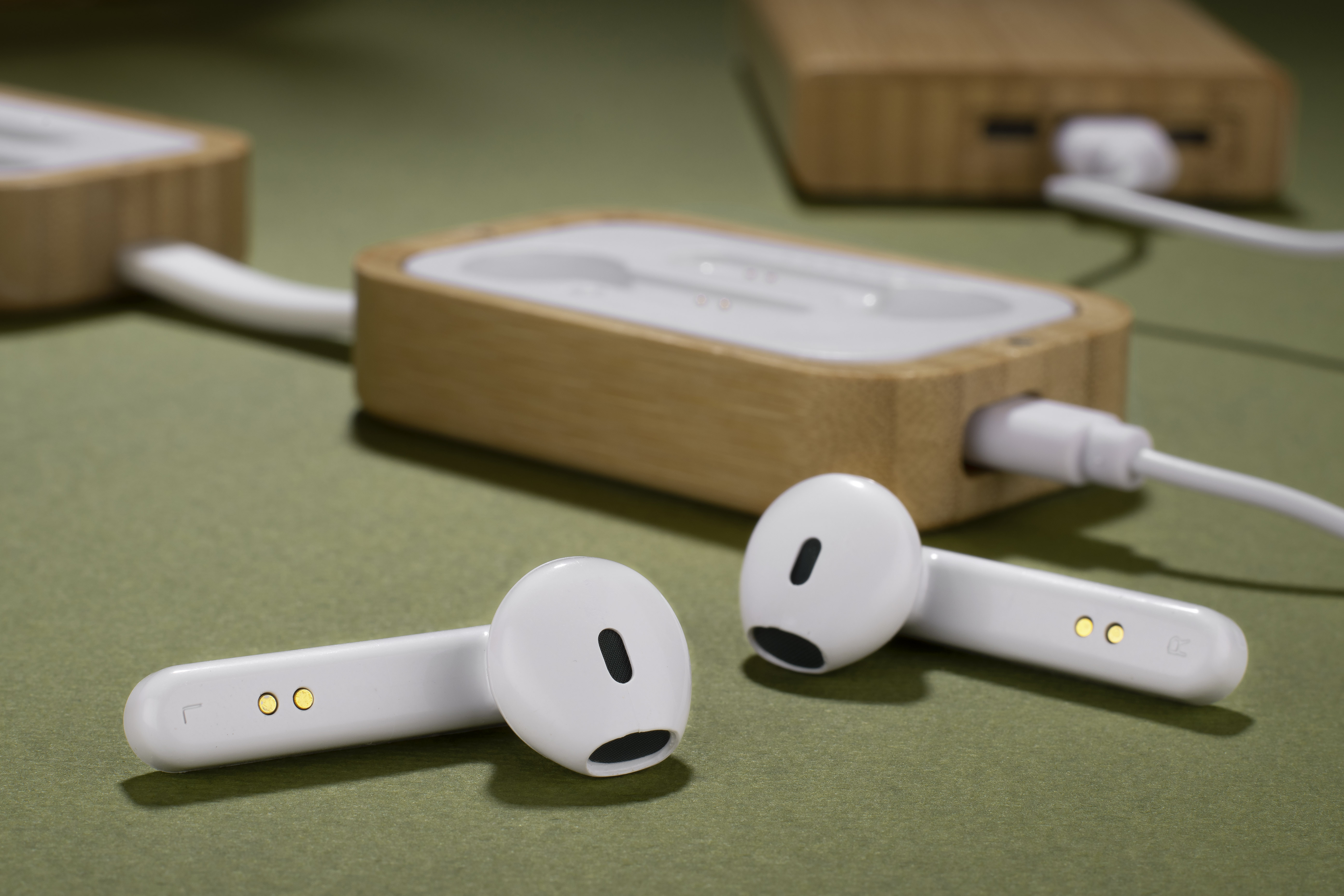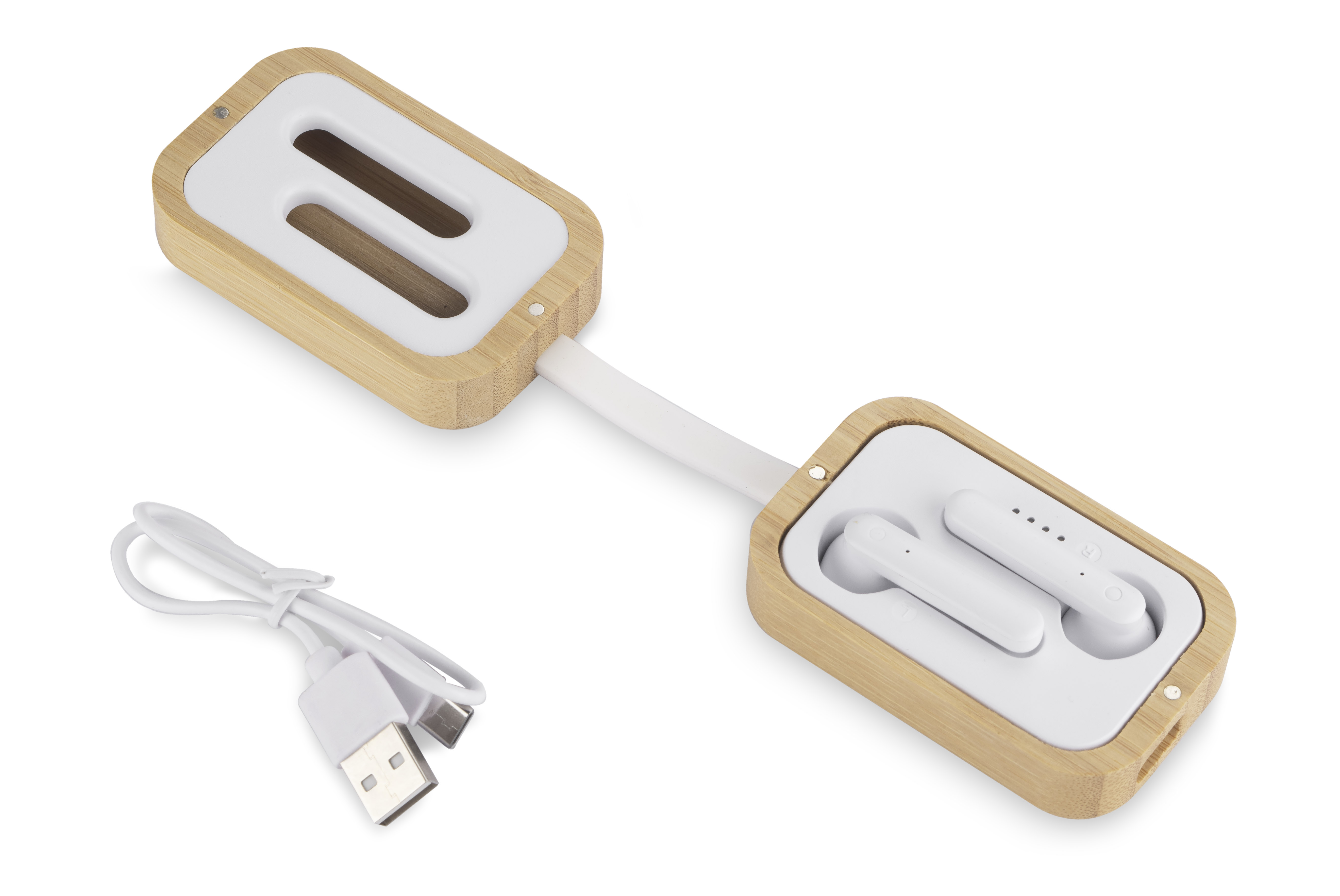Die Wireless-Kopfhörer BAHO sind in einem Bambusgehäuse untergebracht, das magnetisch geschlossen wird. Dank ihrer interessanten und ungewöhnlichen Form wird niemand gleichgültig an ihnen vorbeigehen. Sie sind mit einer Ladeanzeige ausgestattet, so dass Sie nie von einem niedrigen Batteriestand des Geräts überrascht werden. Die Touch-Bedienung des Kopfhörers bietet einen hohen Bedienkomfort. Die Kopfhörer haben ein eingebautes Mikrofon, mit dem Sie telefonieren können. Möglichkeit, nur einen Kopfhörer zu verwenden. Technische Daten: Bluetooth-Version: V5.1, Bluetooth-Reichweite: bis zu 10 m, Akkukapazität in jedem Hörer: 30 mAh, Akkukapazität im Gehäuse: 200 mAh, Betriebsdauer bis zu 3 Stunden, Ladeanschluss Typ-C.