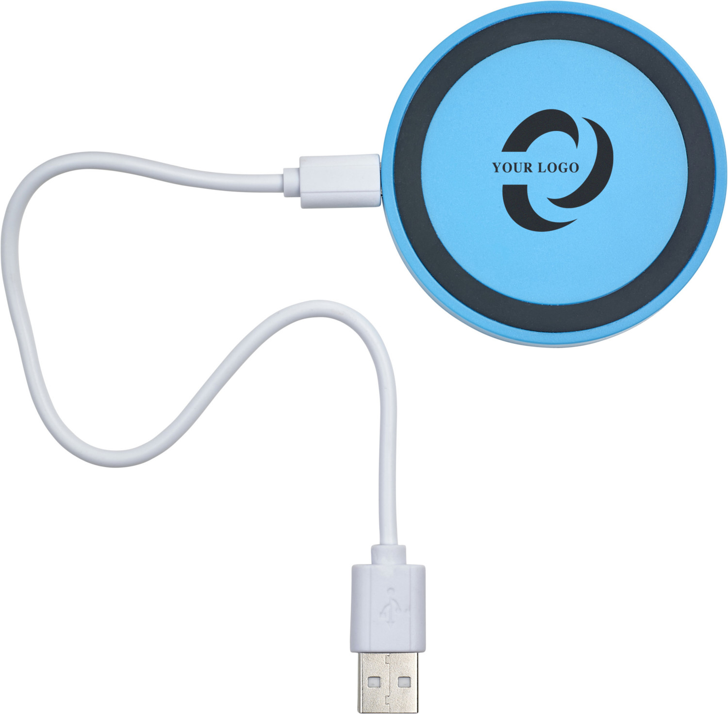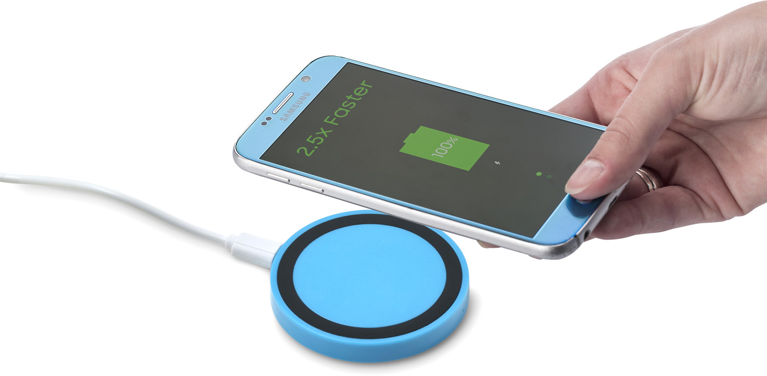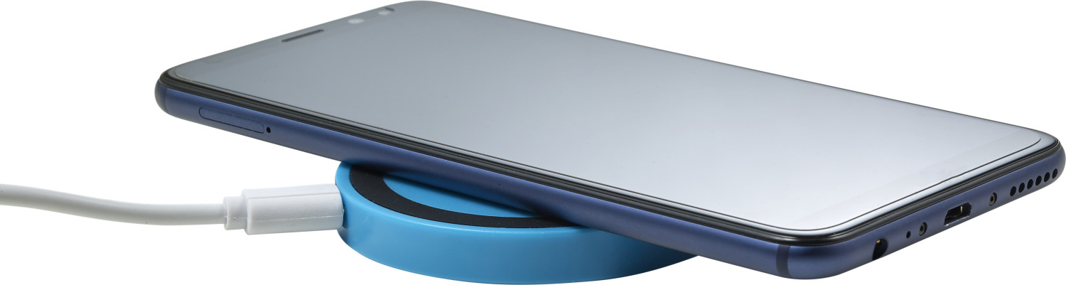 Wireless Ladepad 'Boost', farbig mit schwarzem Kreis auf der Oberseite und rutschfester Unterseite. Im Lieferumfang enthalten ist ein Ladekabel (USB und Micro-USB, Länge ca. 30 cm), Input DC 5V/1500 mAh.