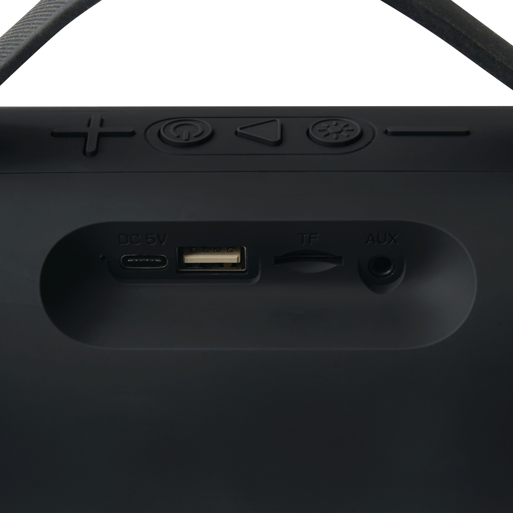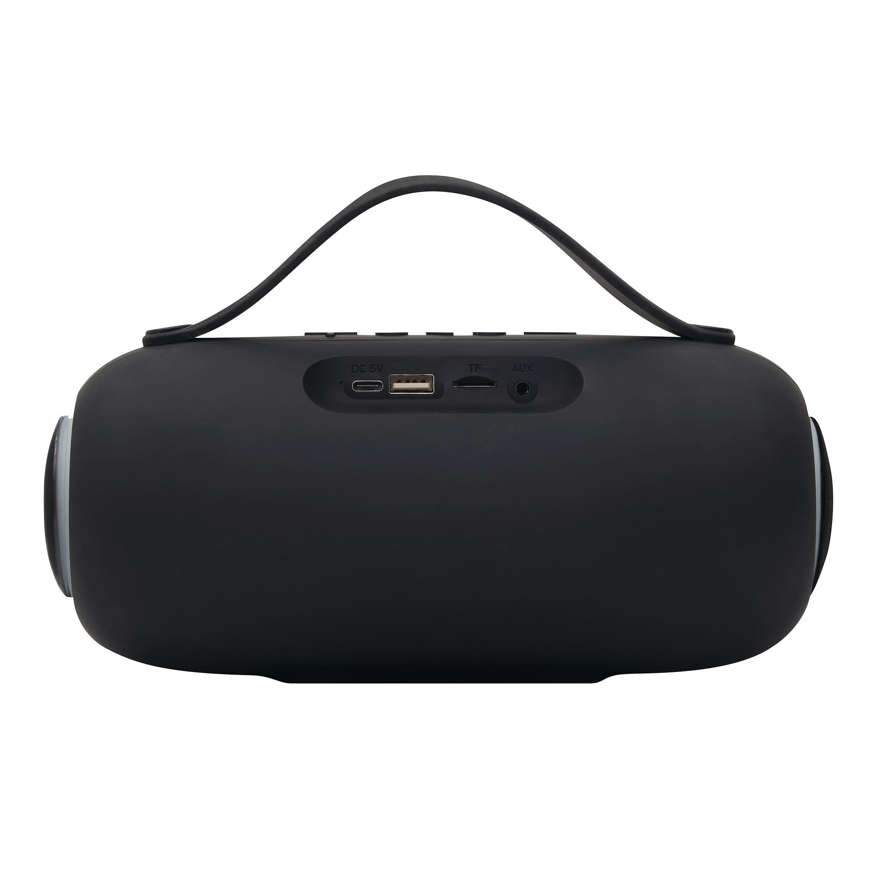 Wireless-Lautsprecher GIGA BOOM: Musikleistung 2 x 5 Watt, zur Kopplung mit wireless-fähigen Geräten, kompatibel zu Bluetooth®, externe Geräte über AUX-Anschluss anschließbar, Reichweite ca. 10 m, microSD-Slot und USB Typ A-Anschluss für MP3-Funktion, Freisprechfunktion, leistungsstarker Lithium-Akku, Kapazität: 1.800 mAh, inkl. USB-Ladekabel mit USB Typ C Stecker (Länge: ca. 50 cm), mit farbwechselndem Licht an den Seiten, schwarzem Silikongriff, Bedientasten sowie An- und Ausschalter oben, rutschhemmender Standfuß und Gravurplättchen mit Chromunterlegung für Ihre Werbeanbringung, in Box