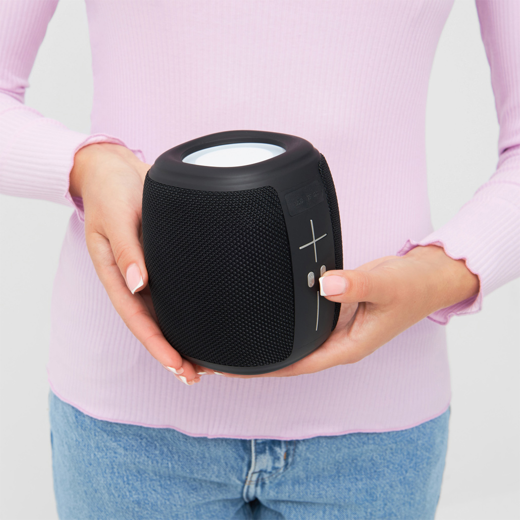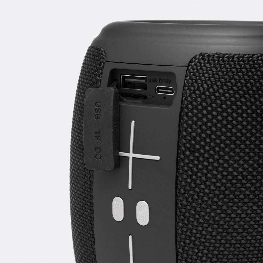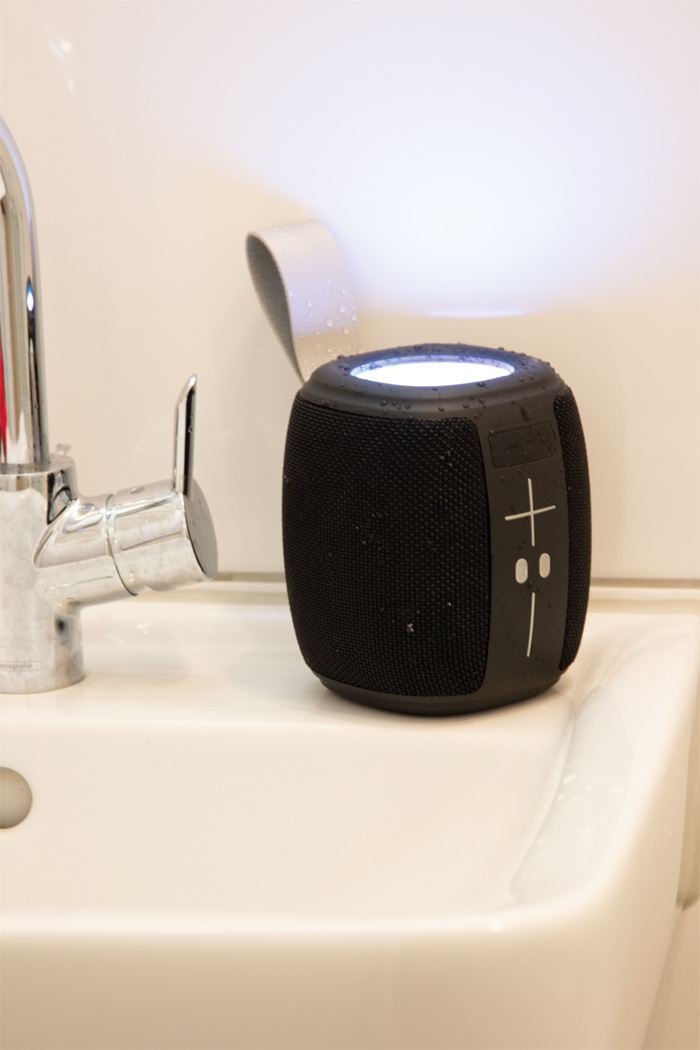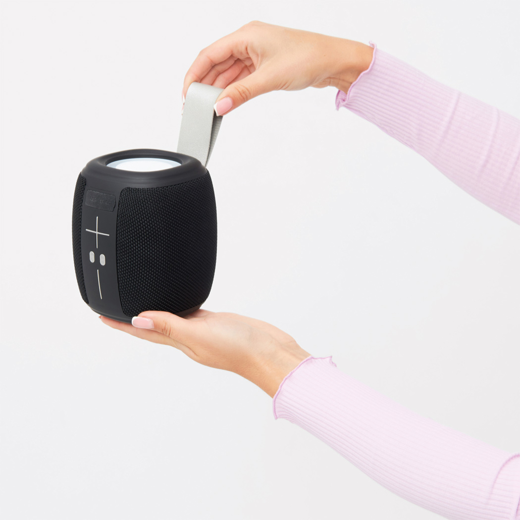 Wireless-Lautsprecher RESISTANT: Musikleistung 1 x 10 Watt, zur Kopplung mit wireless-fähigen Geräten, kompatibel zu Bluetooth®, Reichweite ca. 10 m, microSD-Slot und USB Typ A-Anschluss für MP3-Funktion, Freisprechfunktion, leistungsstarker Lithium-Akku, Kapazität: 1.200 mAh, inkl. USB-Ladekabel mit USB Typ C Stecker (Länge: ca. 50 cm), spritzwassergeschützt nach IPX4, mit farbwechselndem Licht oben, grauer Trageschlaufe, Bedientasten sowie An- und Ausschalter auf der Vorderseite und rutschhemmenden Standfüßen, in Box