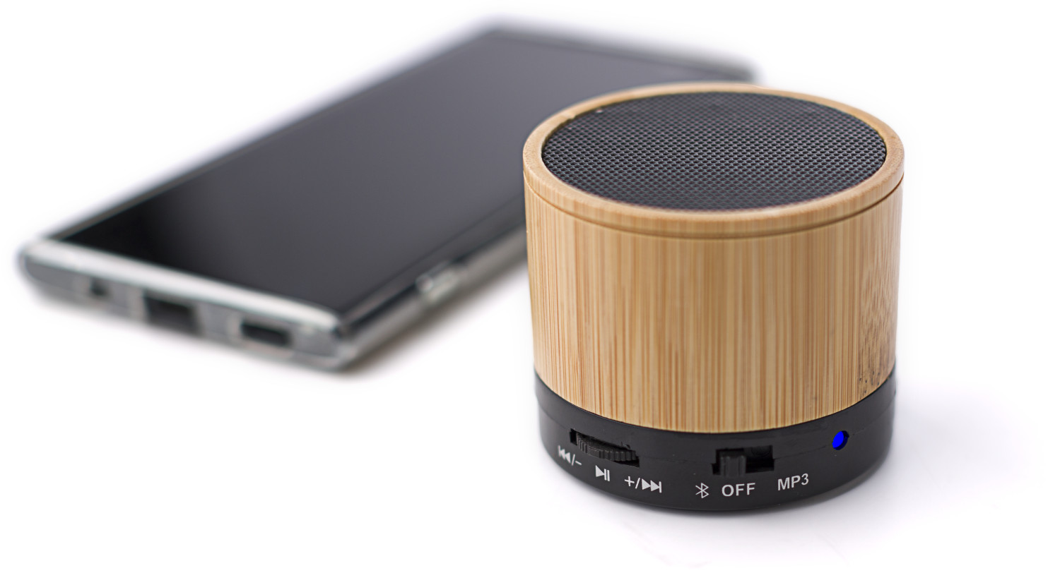 Wireless-Lautsprecher aus Bambus mit Lautstärkeregler und Tasten zum Rück- und Vorspulen. Drahtloser Modus und MP3-Modus. Akku: 300mAh. Batterielebensdauer: 2,5 Stunden. Inklusive Ladekabel.