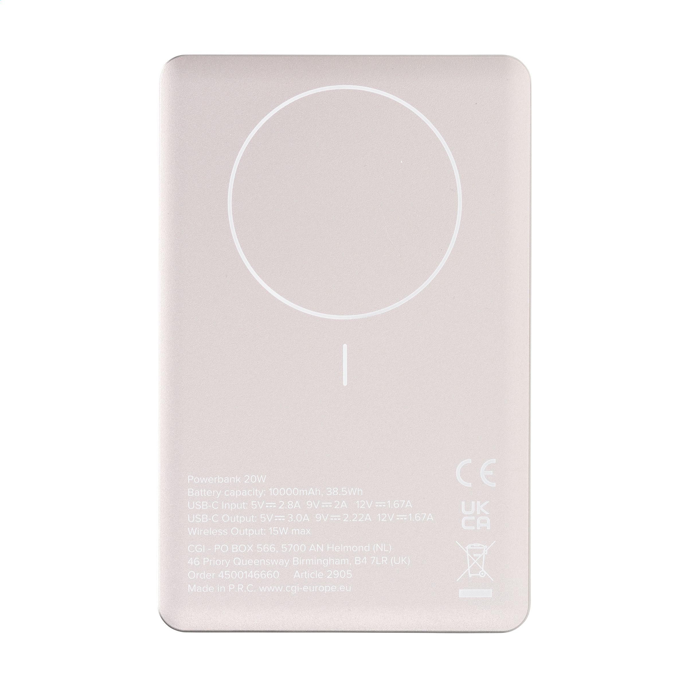 Ultraleichte, leistungsstarke und kabellose Powerbank mit integriertem 10.000-mAh-Lithium-Polymer-Akku. Zum schnellen Aufladen eines Smartphones. Das Gehäuse besteht zu 100% aus RCS-zertifiziertem recyceltem Aluminium. Handliche Größe, passt problemlos in jede Tasche. USB-C-Eingang: 5 V/3 A 9 V/2 A. USB-C-Ausgang: 5 V/3,0 A 9 V/2,22 A 12 V/1,67 A. Kabelgebundener Ausgang: 20 W. Kabelloser Ausgang: 15 W mit Magnetfunktion (MagSafe). Einfach das iPhone auf den Magneten klicken. Die integrierten Magnete im Ladegerät sind perfekt ausgerichtet und sorgen immer für die richtige Ladeposition des iPhone. Kompatibel mit iPhone 12 und höher. Ausgestattet mit Anzeigeleuchten und Ein-/Aus-Taste. Inklusive rTPE-USB-C/USB-C-Ladekabel und Gebrauchsanweisung.