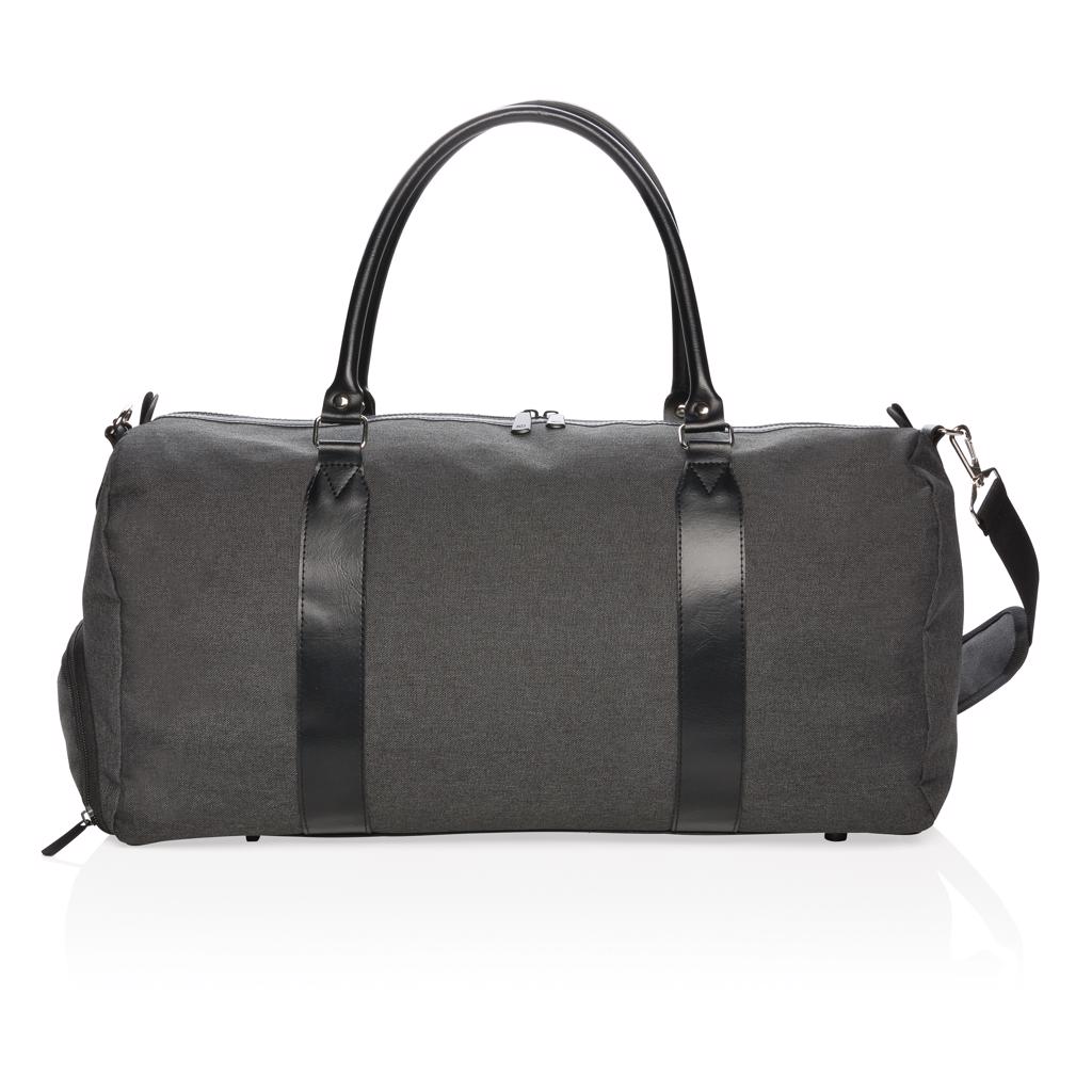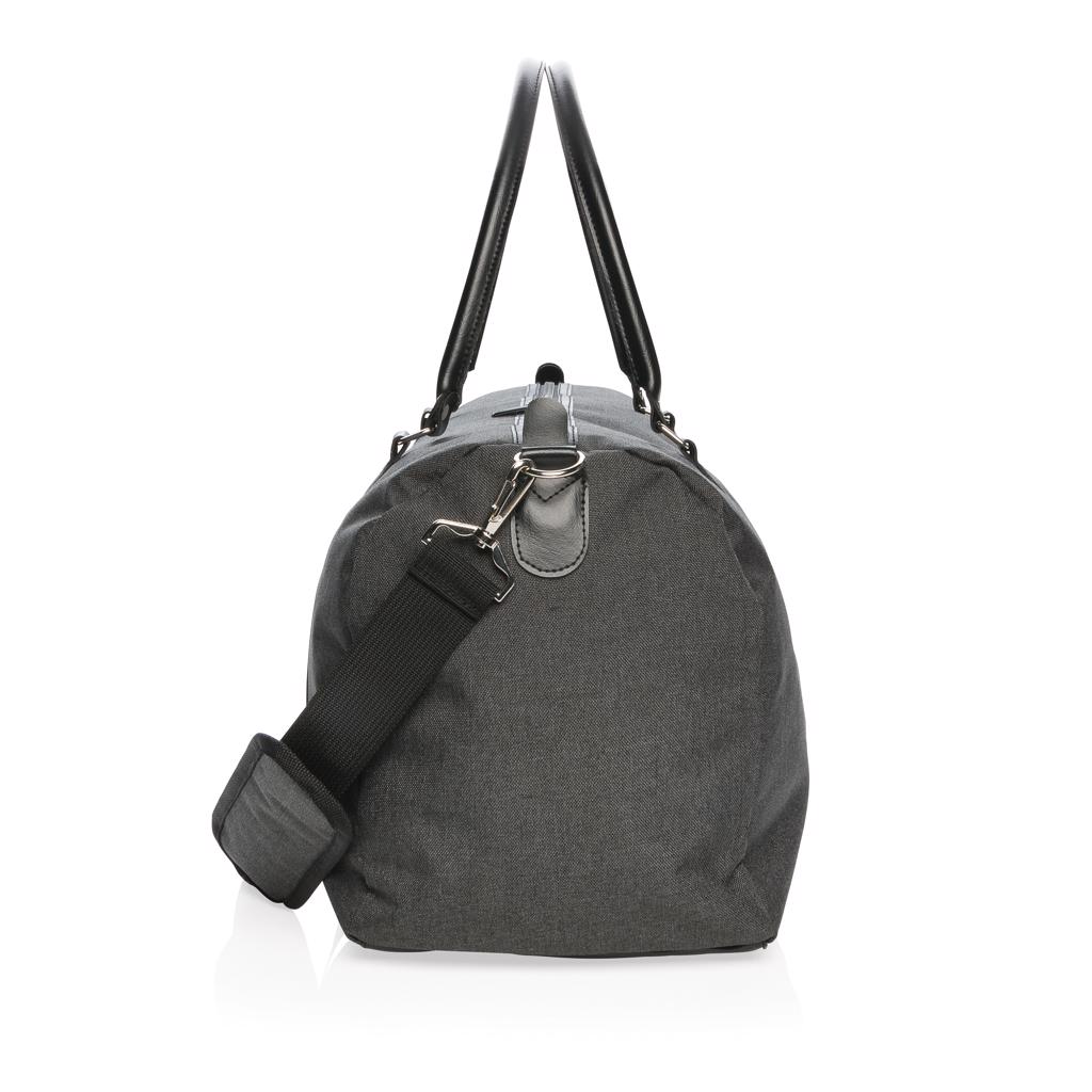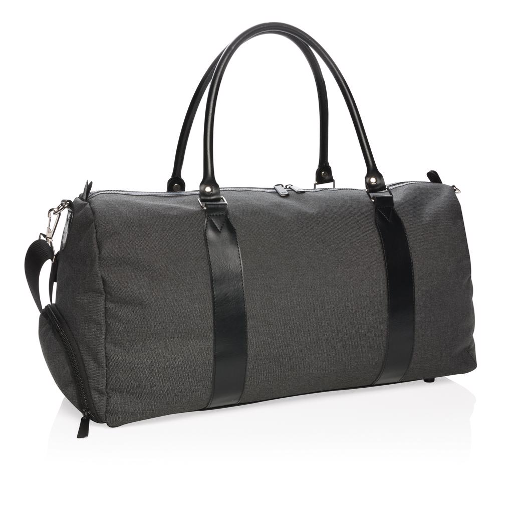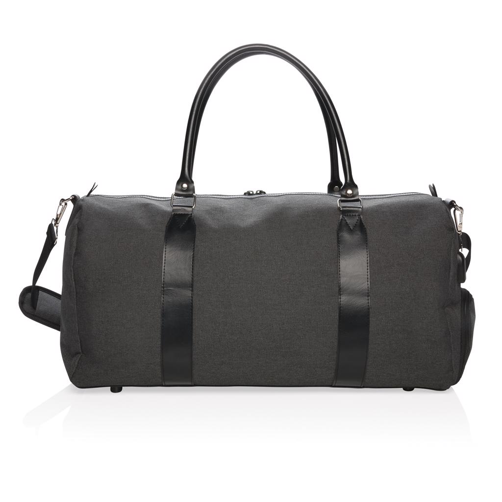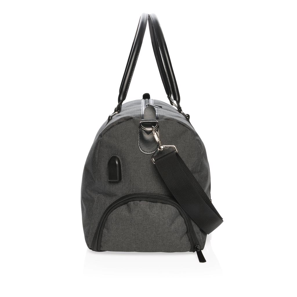 Moderne und minimalistische Wochenendtasche aus 600D Polyester mit PU Tragegriffen und bequemem Schultergurt. Großes Hauptfach mit viel Stauraum für Ihre Wochenendausrüstung oder Sportkleidung. Verbinden Sie Ihre Powerbank ganz einfach mit dem integrierten USB A Port und laden Sie Ihr Telefon oder Tablet - "on the go"! Zudem verfügt die Tasche über eine praktische Eingriffstasche an der Seite. PVC-frei.