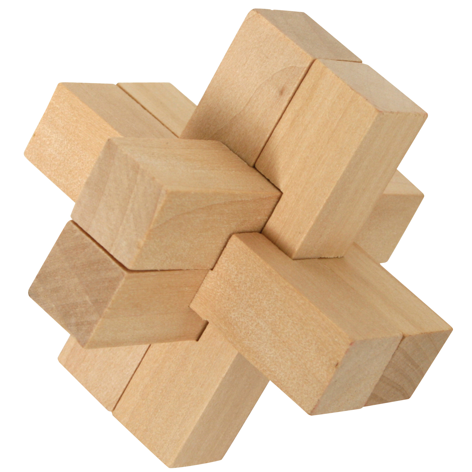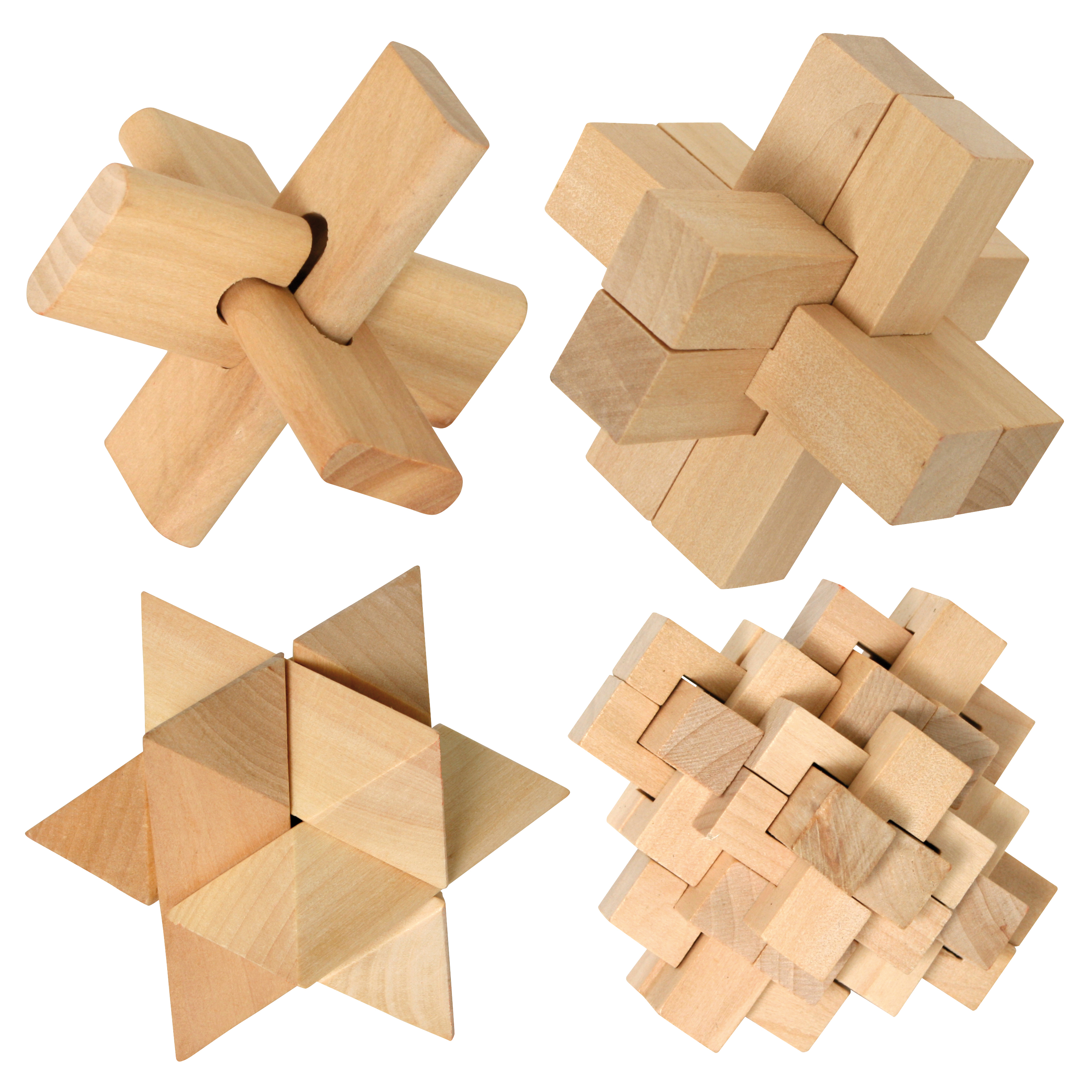 Vier knifflige 3-D-Puzzles aus Holz im Set. Stundenlanger Tüftel-Kniffel-Spaß garantiert. In Geschenkverpackung. Ab 8 Jahren. Puzzlegröße: 7 x 7 x 7 cm.