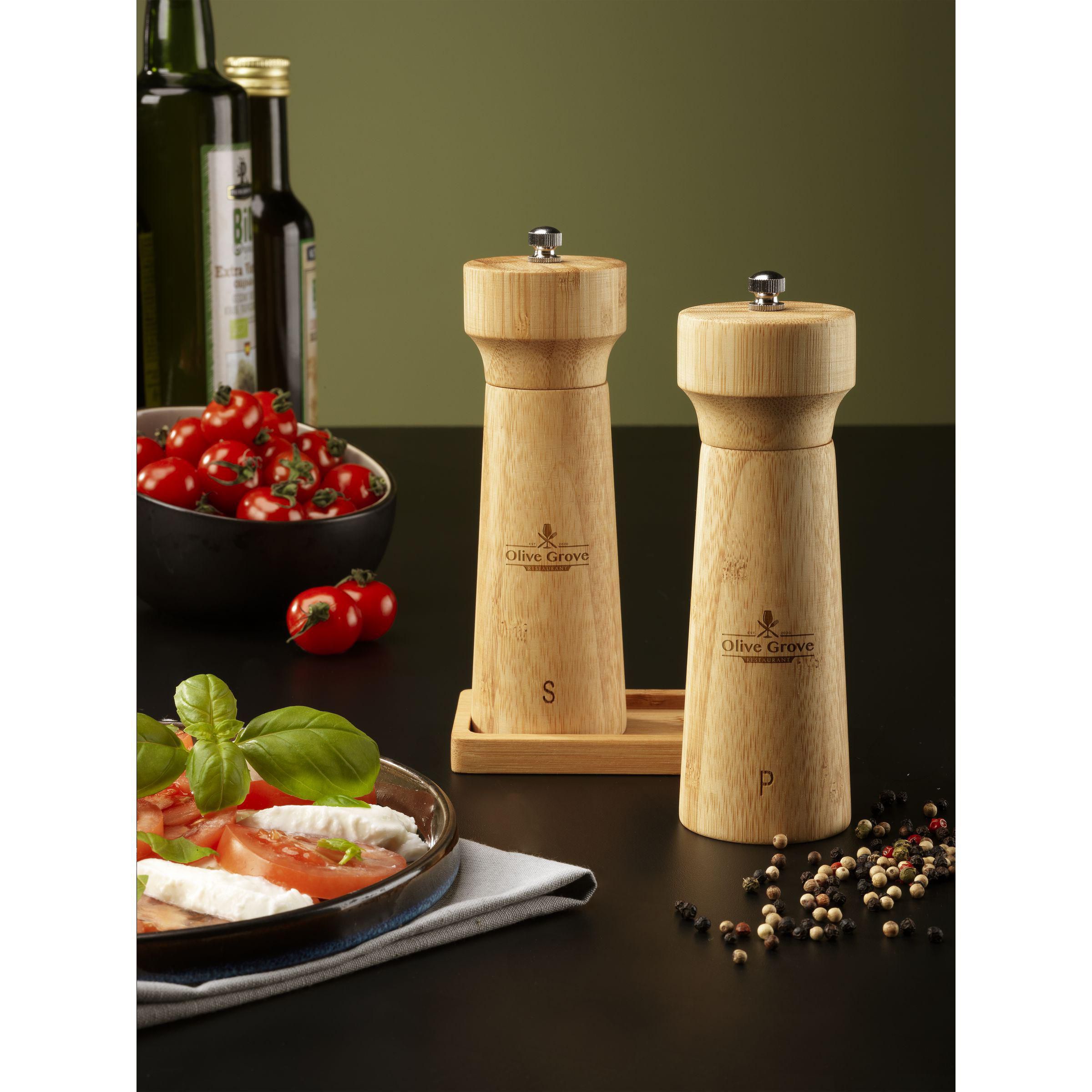Salz- und Pfefferset der Marke Wooosh. Aus aus 100% FSC-zertifiziertem Bambus gefertigt. Beide Mühlen sind mit einem Keramikmahlwerk für eine langlebige und effiziente Nutzung ausgestattet. Beide Mühlen sind nachfüllbar und werden mit einem stilvollen Bambustablett geliefert, das für eine ordentliche Präsentation auf dem Tisch sorgt. Dieses Set vereint Funktionalität mit einem modernen Look und eignet sich perfekt für den Einsatz im Gastgewerbe oder als geschmackvolle Ergänzung in der Küche.