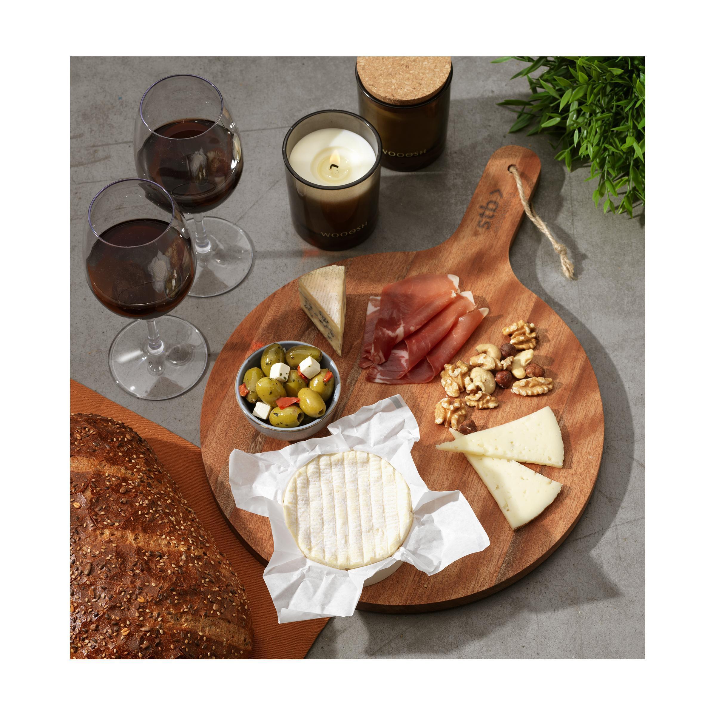 Wunderschönes, geräumiges Wooosh-Servierbrett aus FSC 100% zertifiziertem Akazienholz, einer robusten Holzart mit warmer Ausstrahlung. Die natürlichen Markierungen, die feine Maserung und die unterschiedlichen Farbtöne machen jedes Brett zu einem Unikat. Das Brett wurde sorgfältig mit einem vegetarischen Sojaöl behandelt und ist dank der bakteriziden Eigenschaften von Akazienholz von Natur aus hygienisch. Die runde Form und der Griff verleihen dem Brett ein traditionelles Aussehen, während die Schnur ein praktisches und dekoratives Detail hinzufügt. Ideal für die stilvolle Präsentation von Snacks, Käse, Pizza oder für ein gemütliches gemeinsames Essen. Verpackt pro Stück.