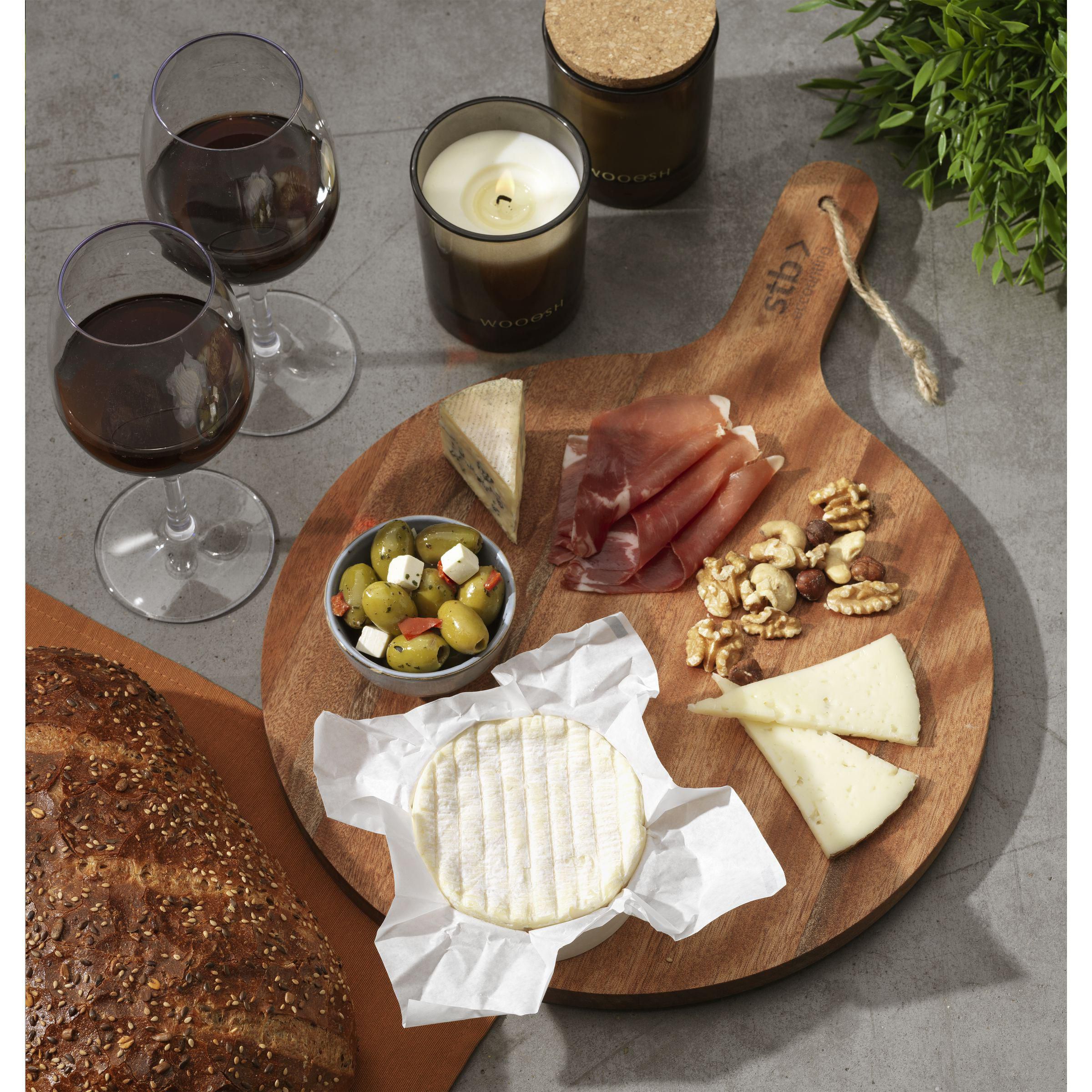 underschönes, geräumiges Wooosh-Servierbrett aus FSC 100% zertifiziertem Akazienholz, einer robusten Holzart mit warmer Ausstrahlung. Die natürlichen Markierungen, die feine Maserung und die unterschiedlichen Farbtöne machen jedes Brett zu einem Unikat. Das Brett wurde sorgfältig mit einem vegetarischen Sojaöl behandelt und ist dank der bakteriziden Eigenschaften von Akazienholz von Natur aus hygienisch. Die runde Form und der Griff verleihen dem Brett ein traditionelles Aussehen, während die Schnur ein praktisches und dekoratives Detail hinzufügt. Ideal für die stilvolle Präsentation von Snacks, Käse, Pizza oder für ein gemütliches gemeinsames Essen.