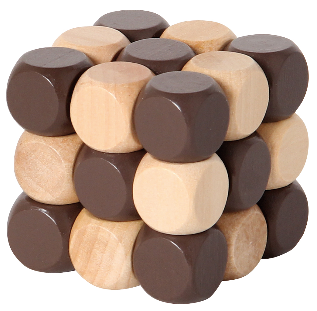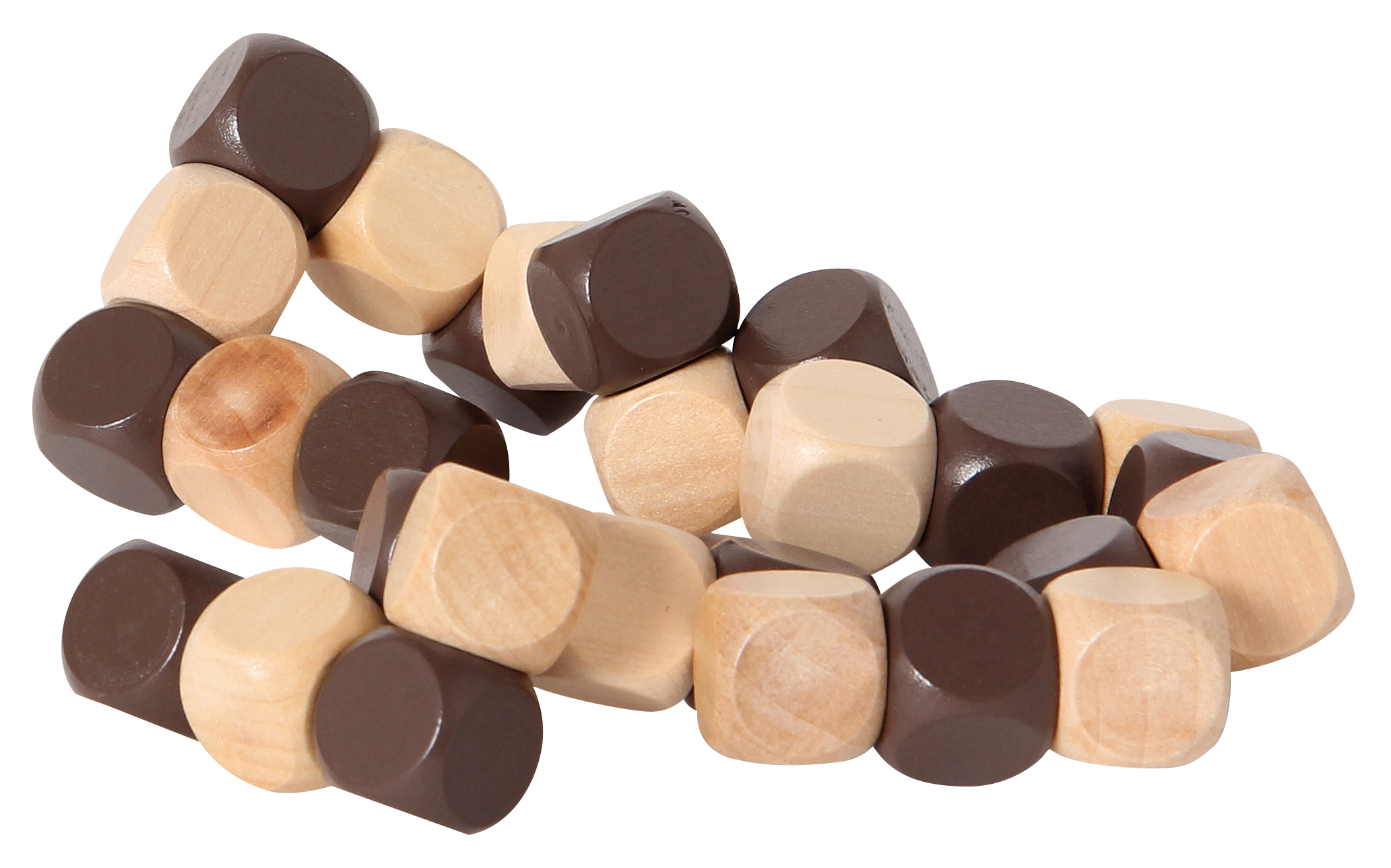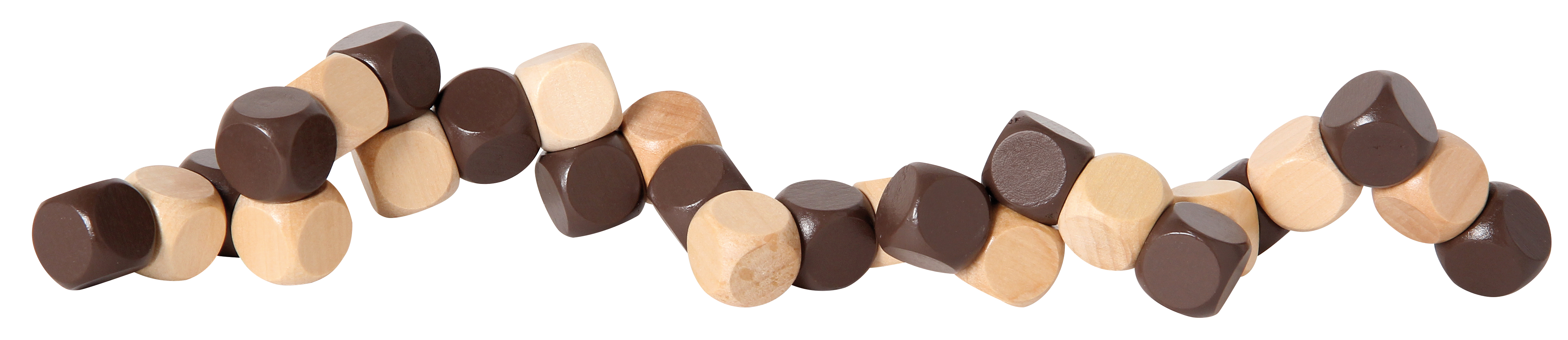 Eine Schlange aus 27 Holzwürfeln rollt sich zusammen und wird zum Würfel. (Wenn man weiß, wie es geht). Ideal für die Reise, da die Teile fest miteinander verbunden sind und deshalb nicht verloren gehen können.