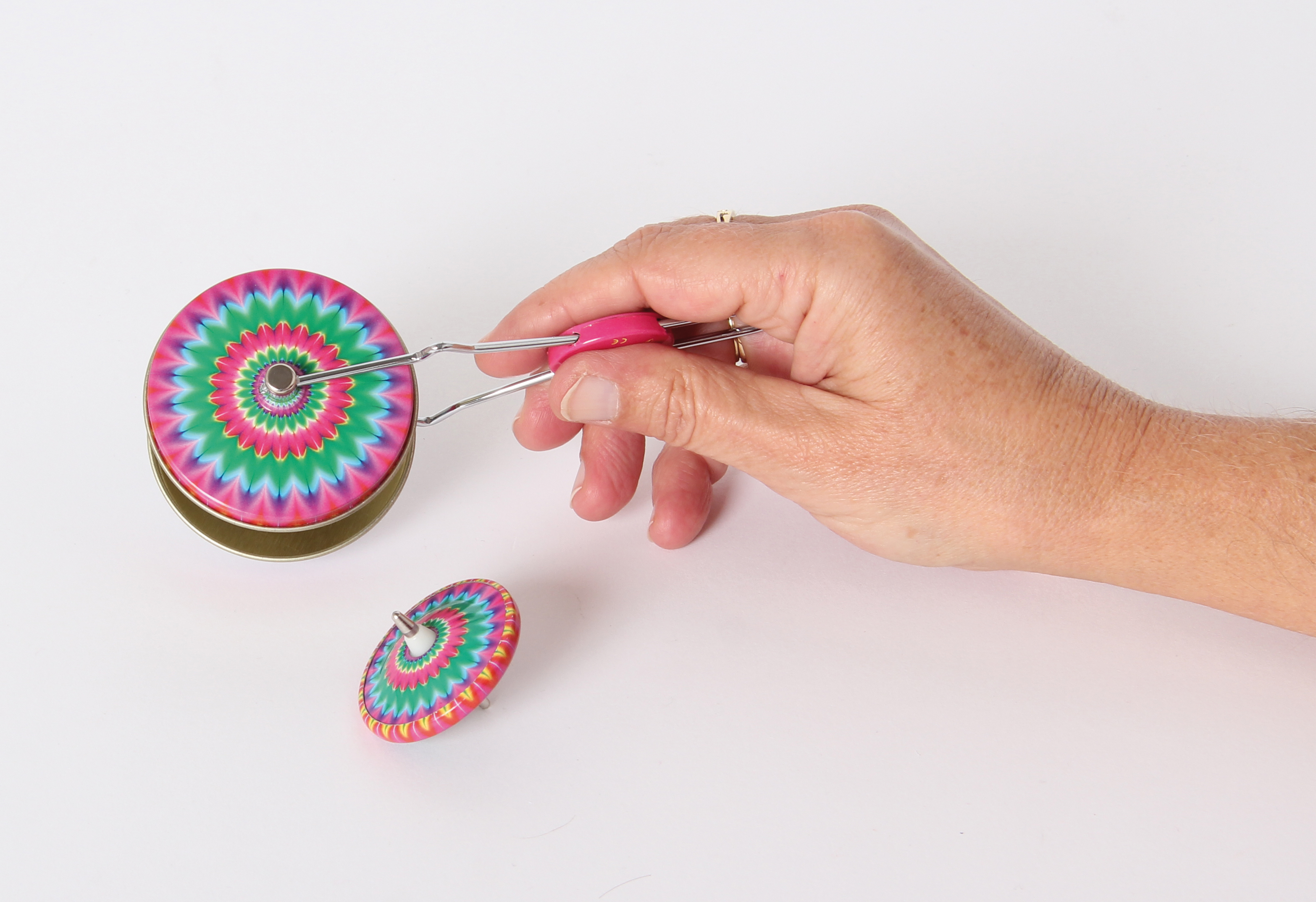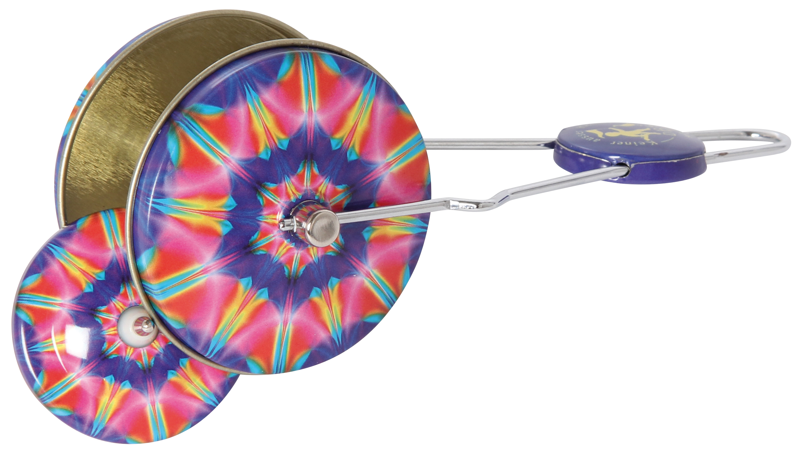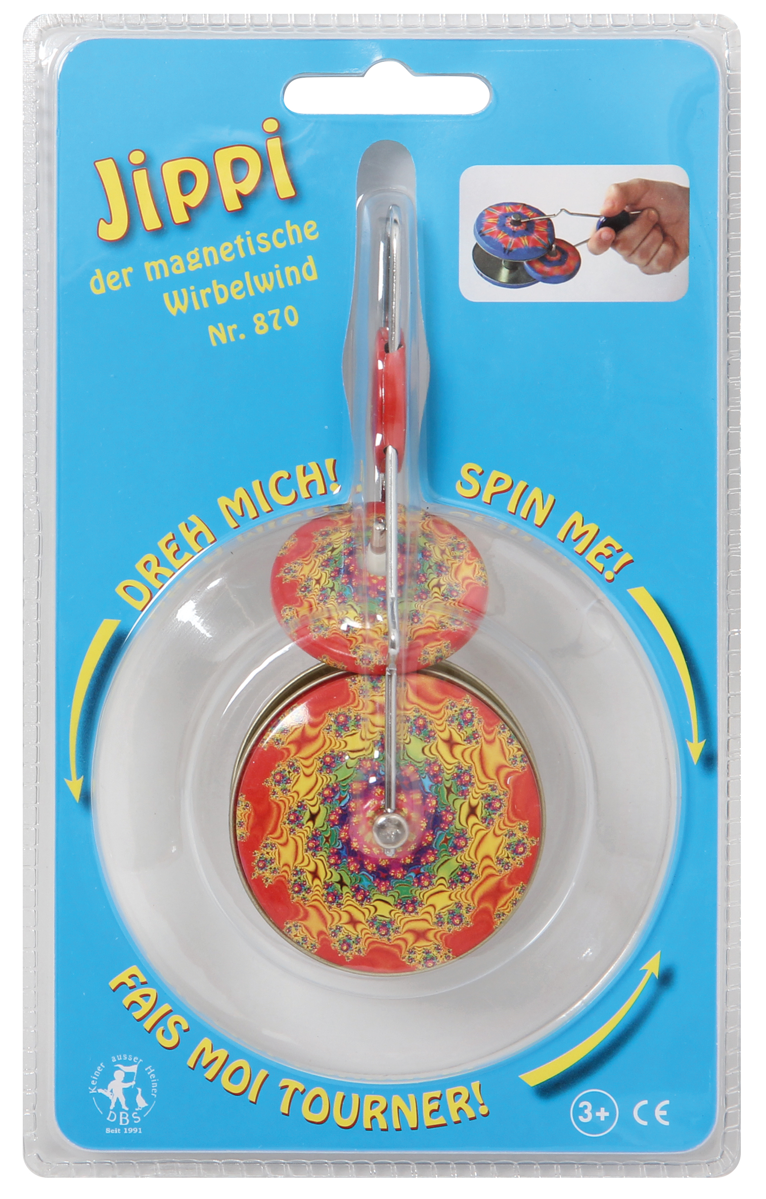 Der Kreisel wird außen auf die Metallschienen aufgesetzt, durch kreisende Bewegungen wird der Kreisel in Schwung gebracht. Schleudert man ihn nun waagrecht auf den Boden, kreiselt er weiter und kann auch wieder mit dem Handteil aufgenommen werden. Verschiedene Designs sortiert.