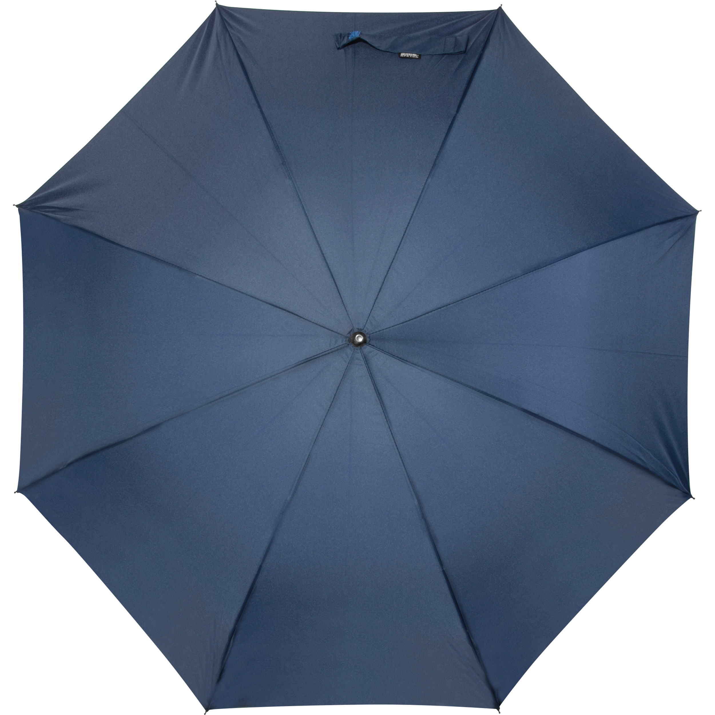 Automatiksturmschirm (windproof) mit aus 190T recyceltem Polyester mit gebogenem Kunststoffgriff (ABS) und Metallspitzen. Ihre Werbung drucken wir auf ein Segment. Druck auf dem Verschlussband auf Anfrage möglich.