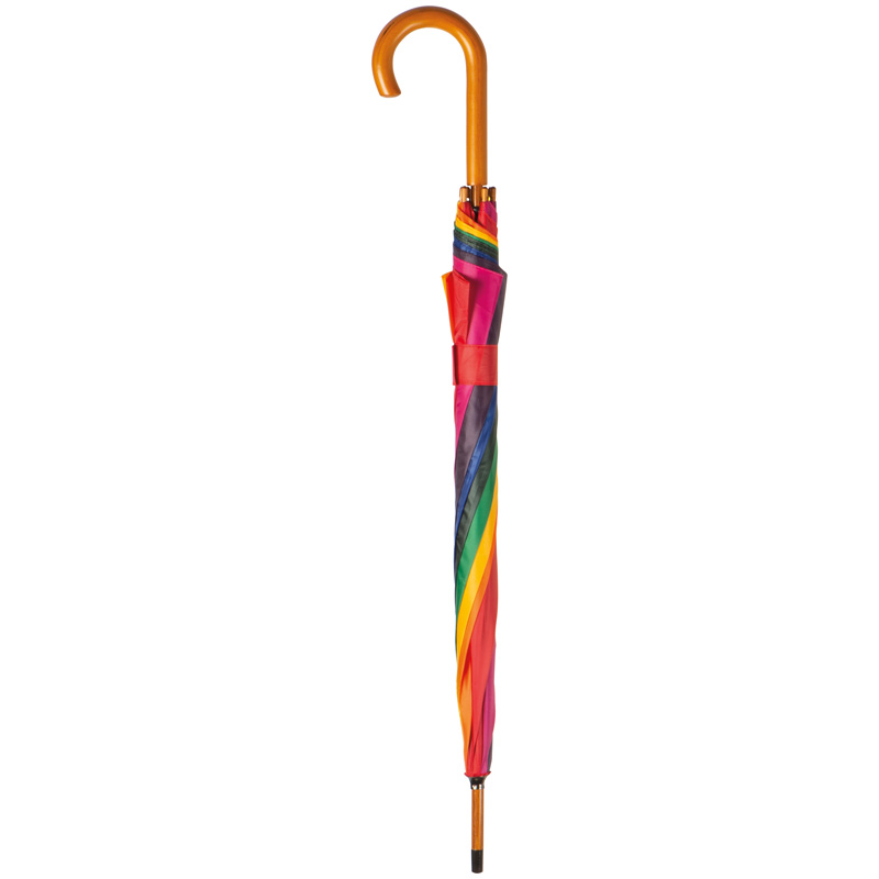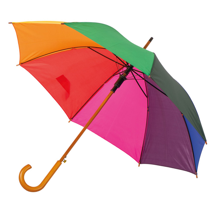 Attraktiver, multicolor Automatikschirm mit 190T Polyesterbespannung, gebogenem Holzgriff und Holzschaft, sowie einem Metallgestänge. Ihre Werbung drucken wir auf ein Segment.