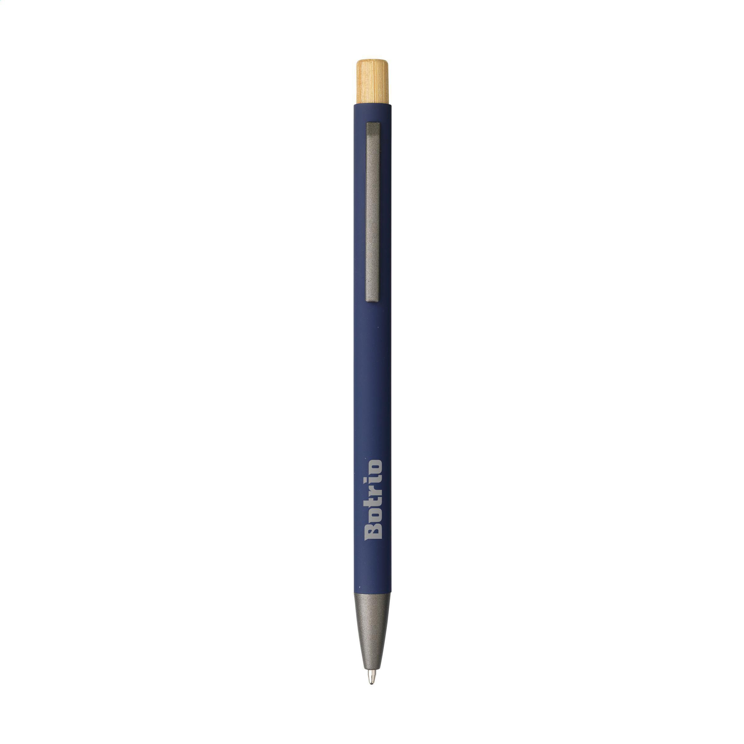 Beschreibung: Blauschreibender, schlanker Kugelschreiber mit einem Gehäuse aus 100% recyceltem Aluminium mit gummierter Oberfläche. Metallclip. Schlankes Design. Der Bambus-Druckknopf verleiht dem Stift eine natürlicher Akzent. GRS-zertifiziert.Durch die Verwendung von recyceltem Aluminium kommt eine geringere Menge an neuen Rohstoffen zum Einsatz. Das bedeutet weniger Energieverbrauch und weniger Wasserverbrauch.