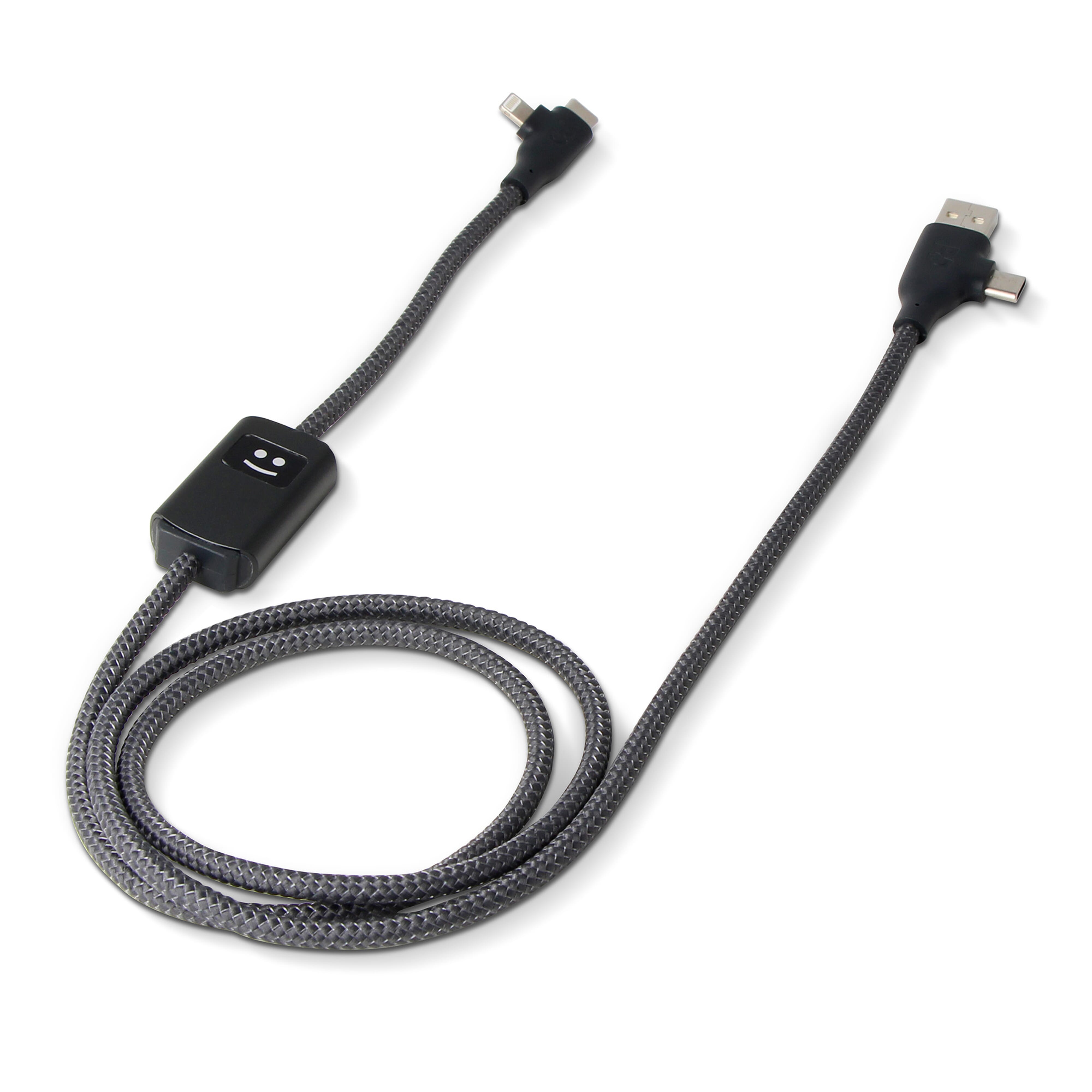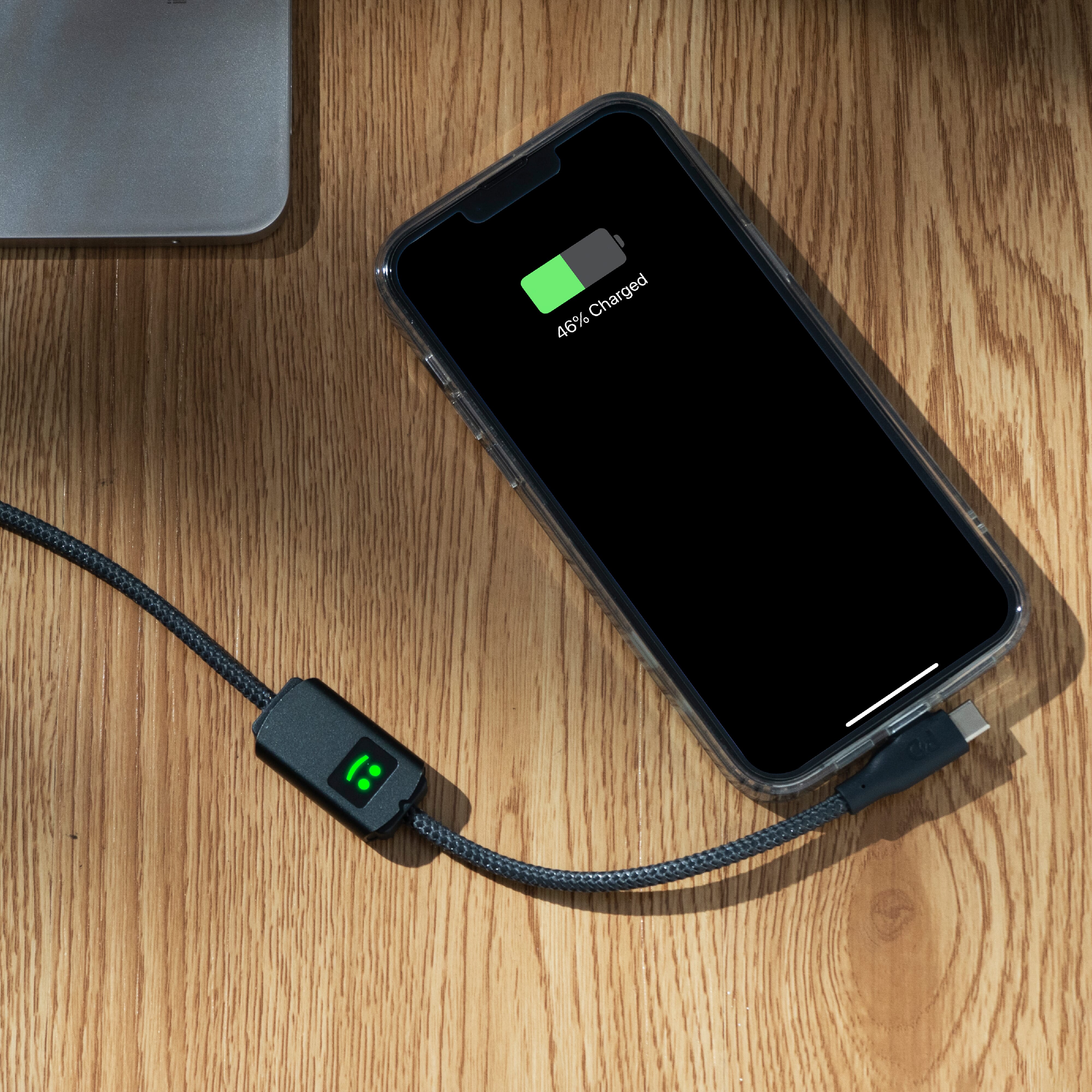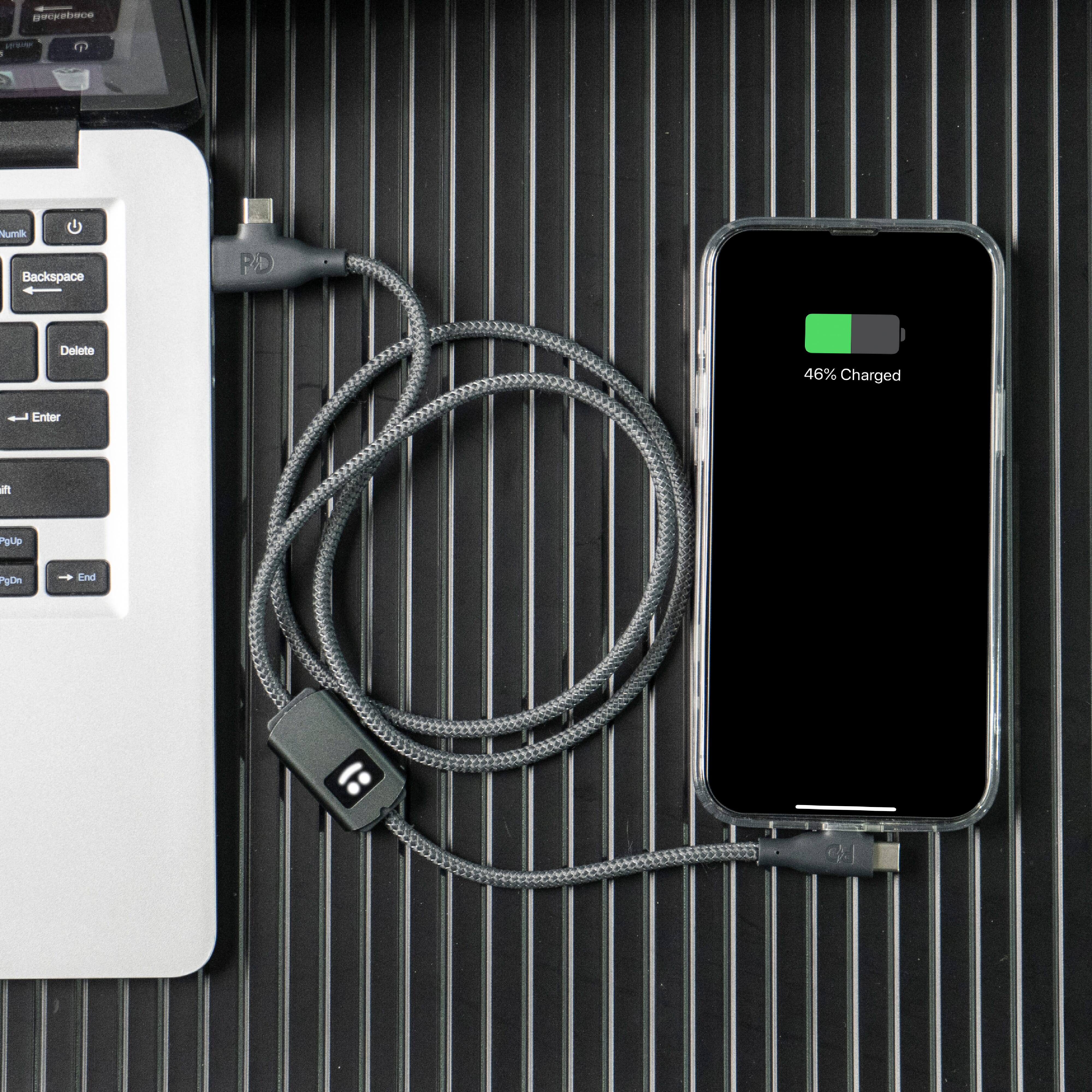 Clever aufladen! 100W für MacBooks, Laptops, Tablets, Smartphones. Cleveres Smiley-Symbol: schnelles (grünes) oder normales (weißes) Laden. Aus recyceltem Aluminium und Kunststoff für schnelles Laden und Datentransfer.