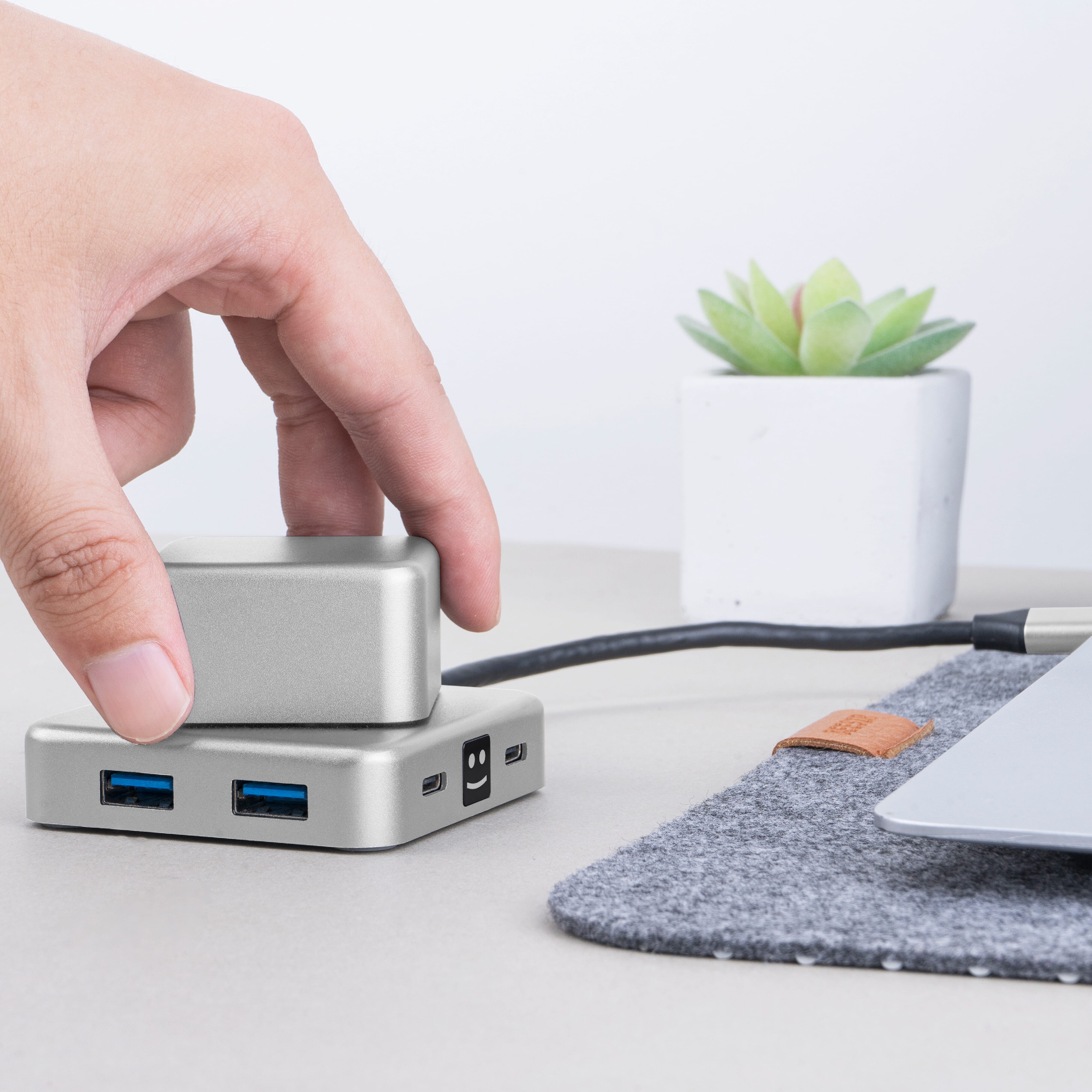 Hier gibt es keine Kompromisse! Unser Hub ist aus recyceltem Aluminium gefertigt, bietet eine stressfreie Rotation, unterstützt das Laden von Laptops mit bis zu 100 W PD und verfügt über mehrere Anschlüsse - 2 USB-A, 2 USB-C, HDMI und einen Audioanschluss. Erhöhen Sie Ihre Konnektivität auf nachhaltige Weise!