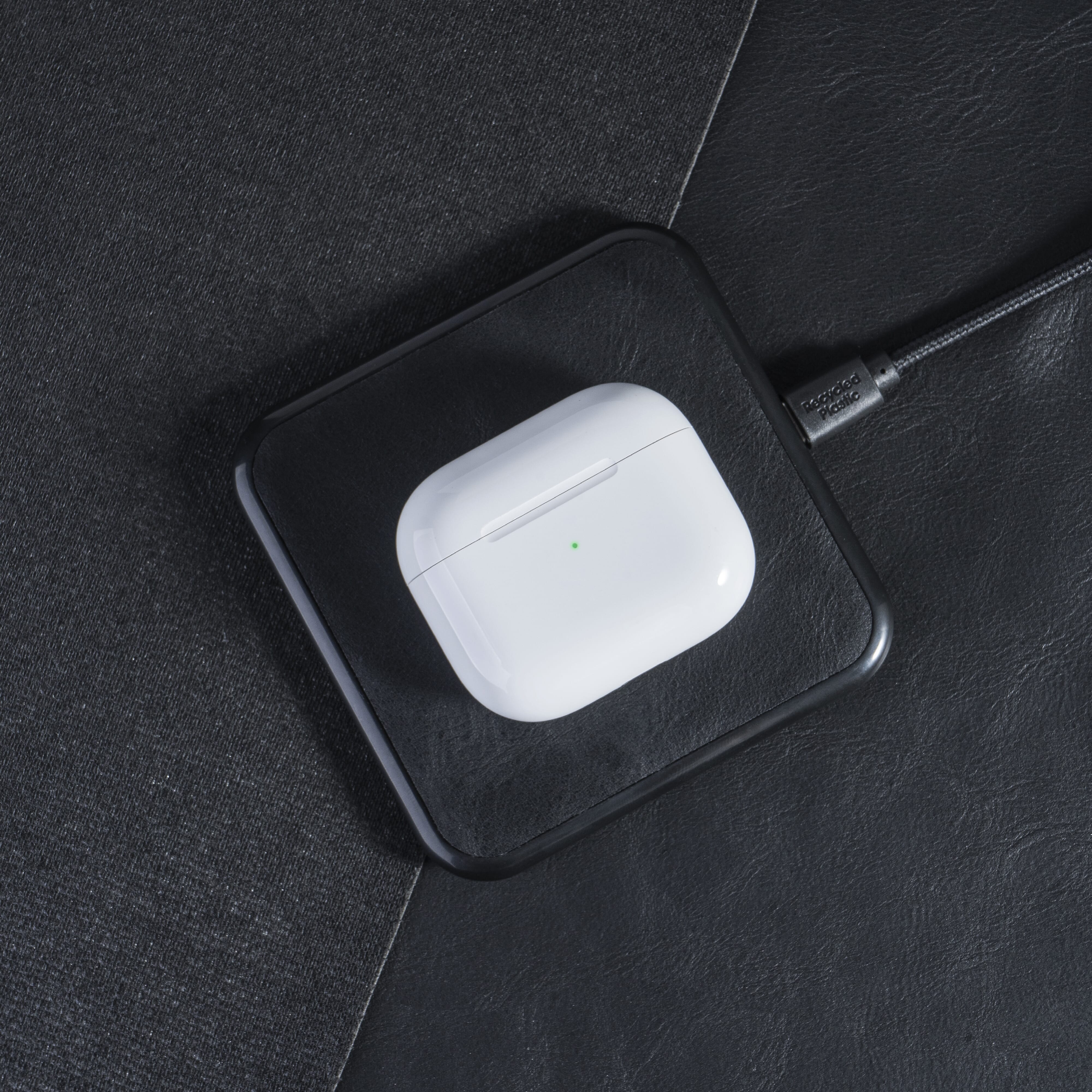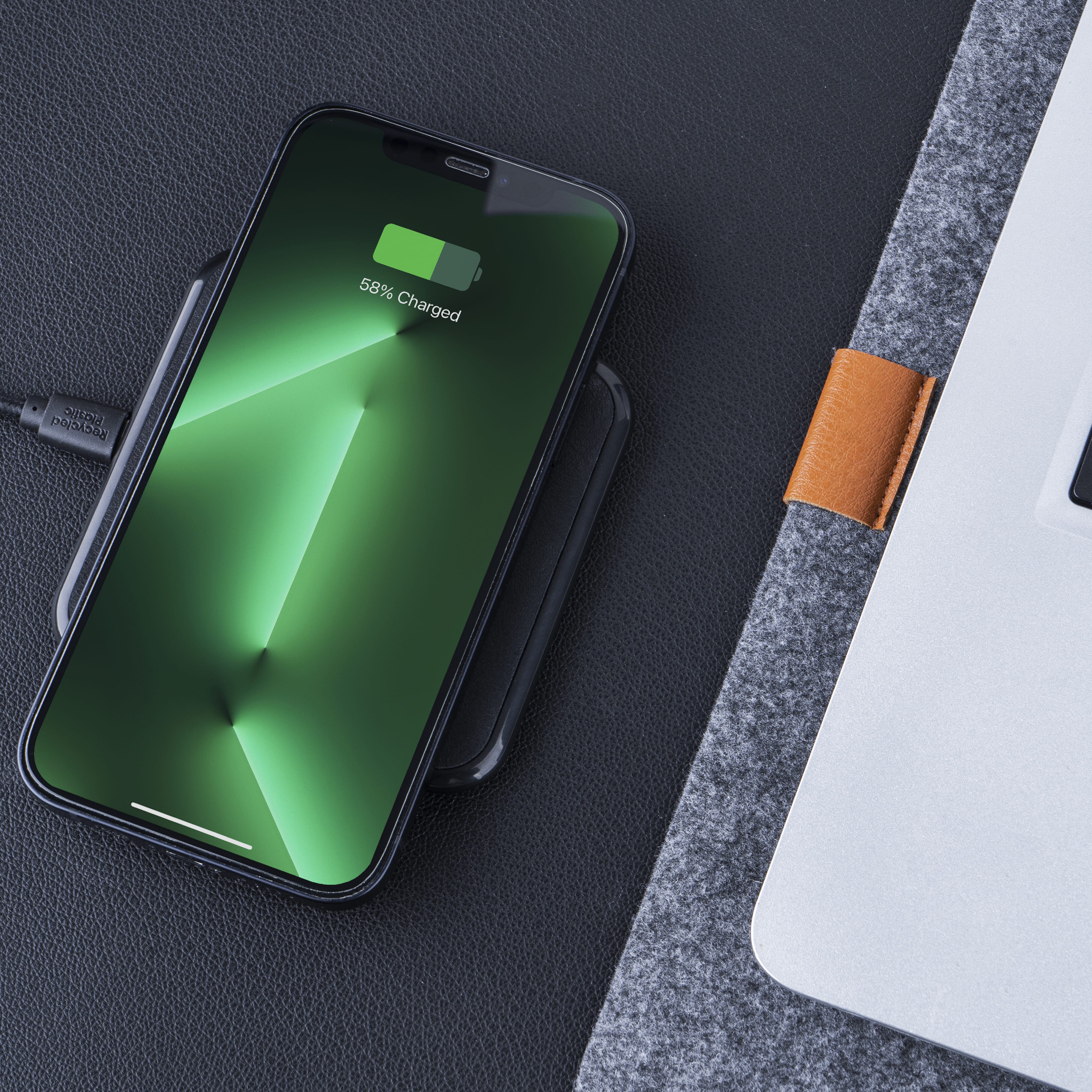Ein kabelloses Ladegerät, das Ihre Geräte superschnell auflädt. Mit diesem Ladegerät müssen Sie nicht lange warten, bis Sie Ihre Geräte wieder benutzen können. Das recycelte Leder macht es außerdem zu einer nachhaltigen Alternative zum normalen Ladegerät.