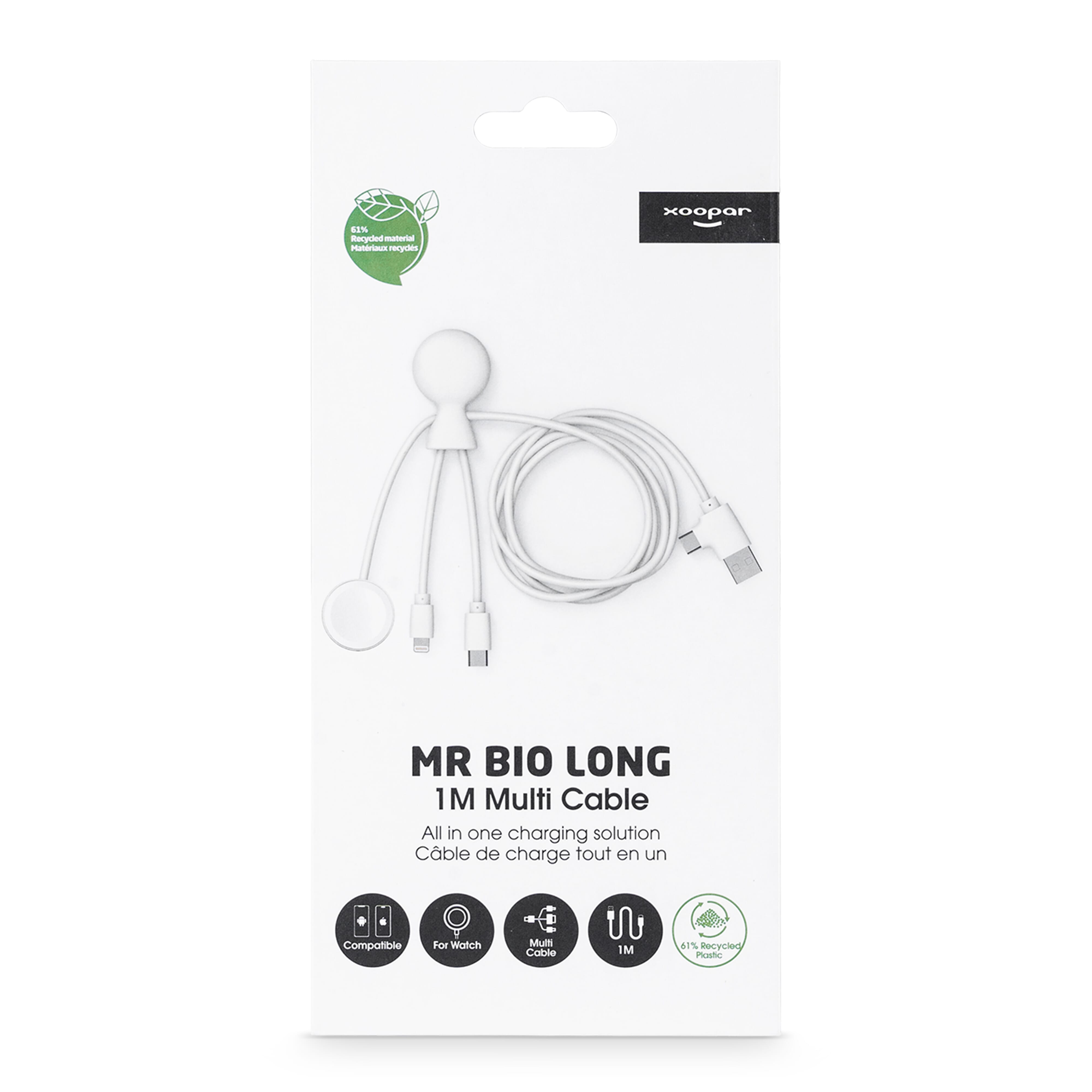 Das Xoopar Mr. Bio-Kabel ist eine nachhaltige Ladelösung für alle Ihre Geräte. Es besteht zu 61 % aus recyceltem Kunststoff und unterstützt Apple Watch, Samsung Watch, Lightning und USB-C. Mit einer maximalen Leistung von 12 W lädt es sicher und effizient. Kompakt und umweltfreundlich, ideal für zu Hause oder unterwegs.