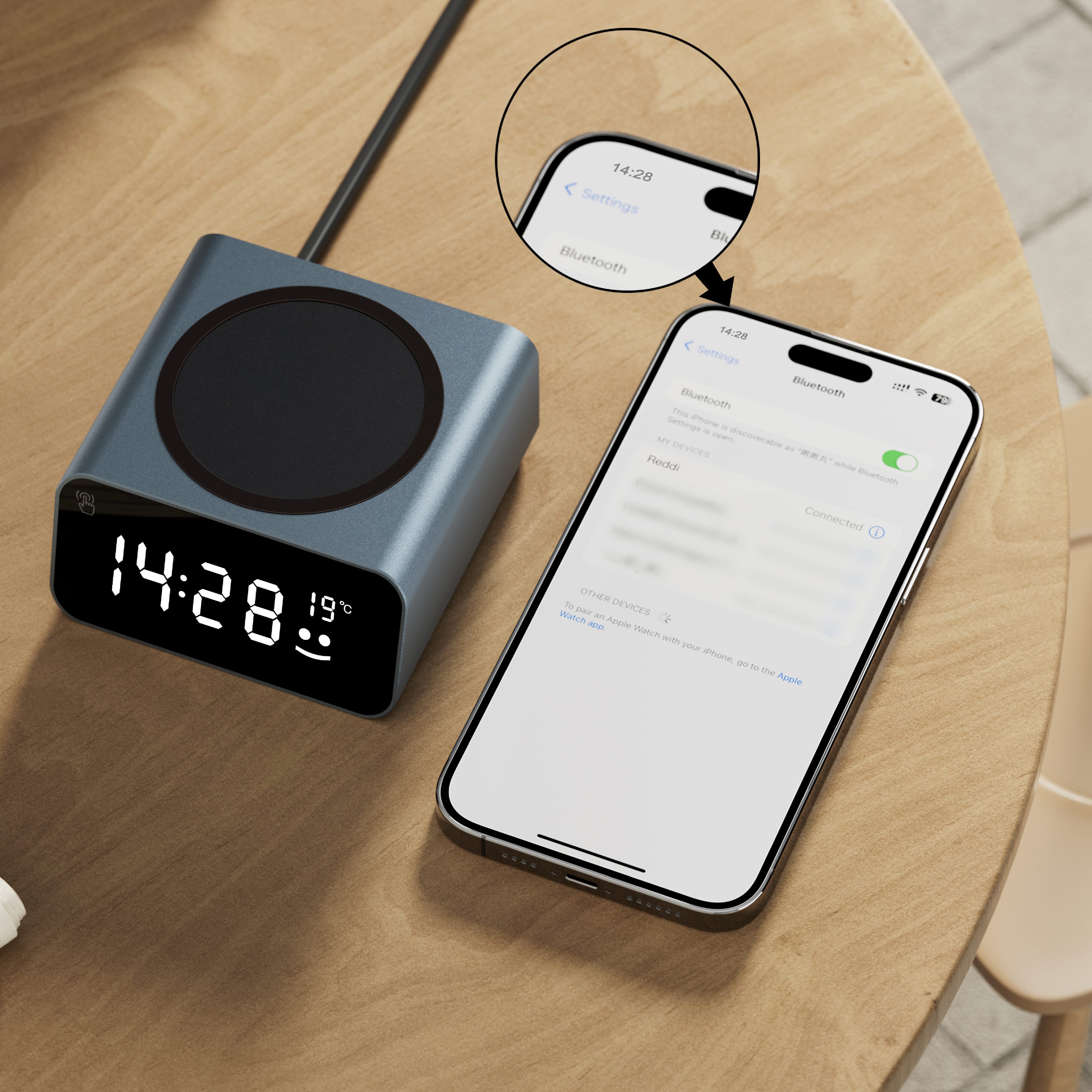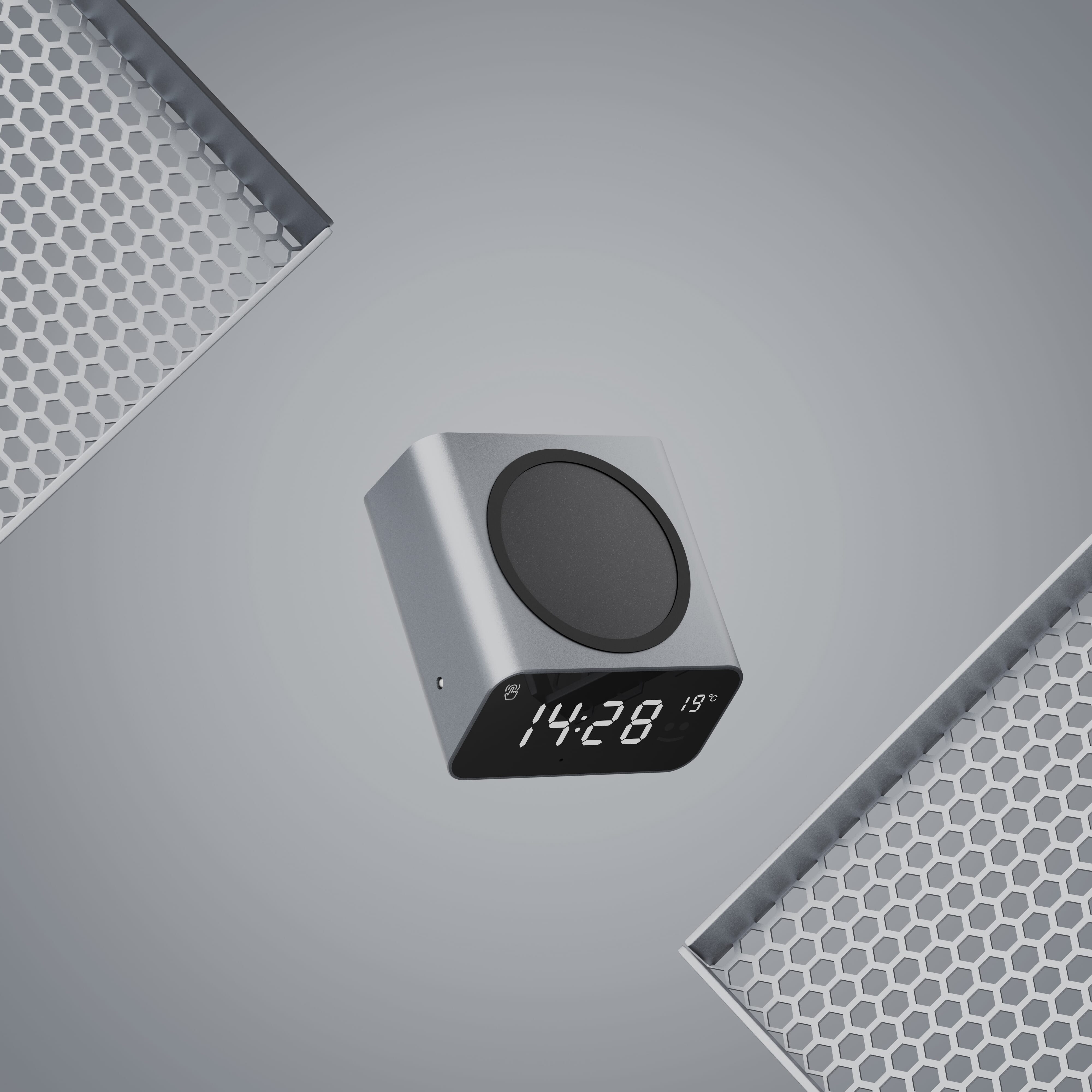 Erleben Sie Innovation! Unsere Uhr mit kabellosem Ladegerät, die aus recyceltem Aluminium gefertigt ist, liefert eine schnelle 15-W-Ladung. Das Smiley-Symbol leuchtet während des Schnellladevorgangs. Mit Temperaturüberwachung, automatischer Zeiteinstellung und einer Weckfunktion ist sie ein Meilenstein in Sachen Komfort und Nachhaltigkeit.