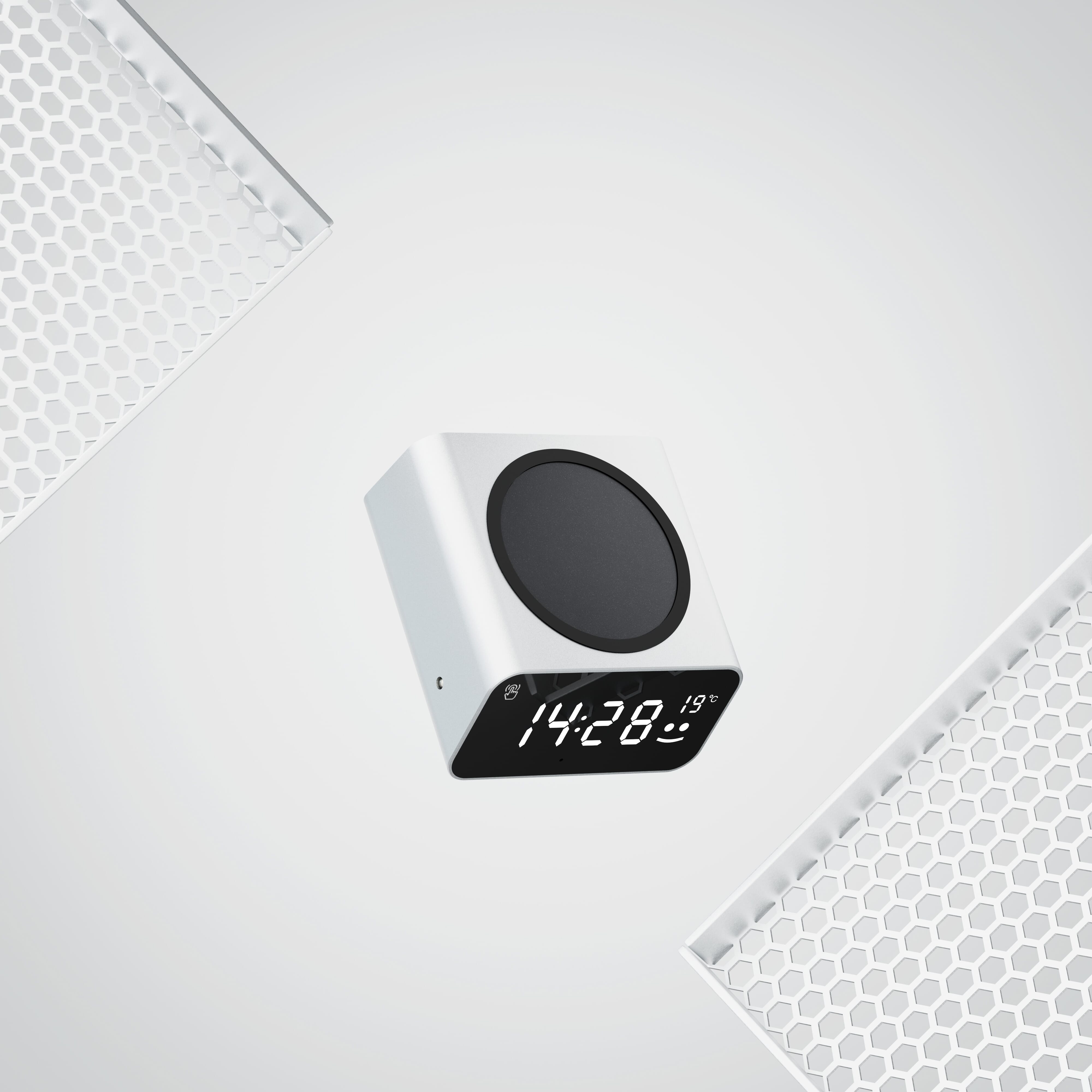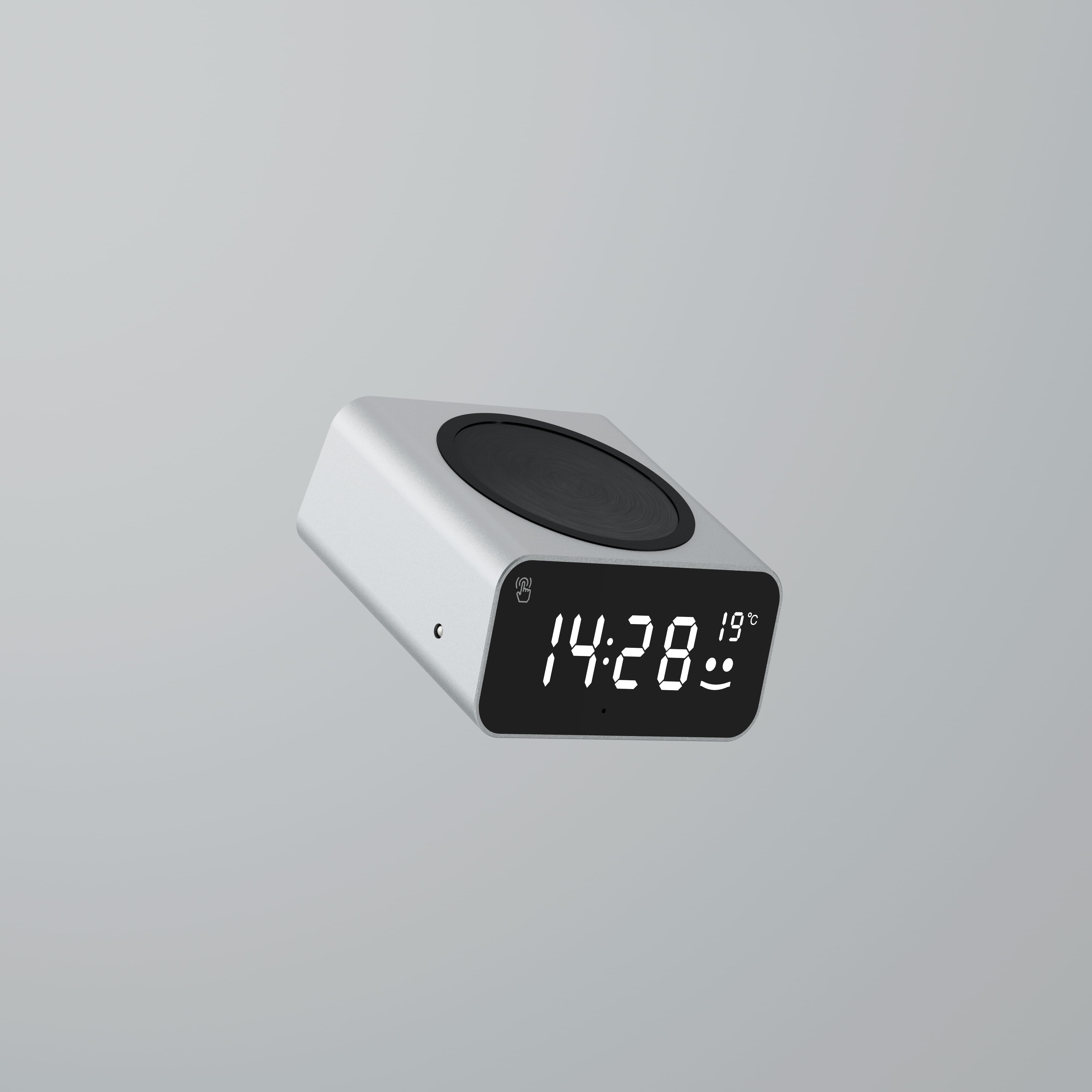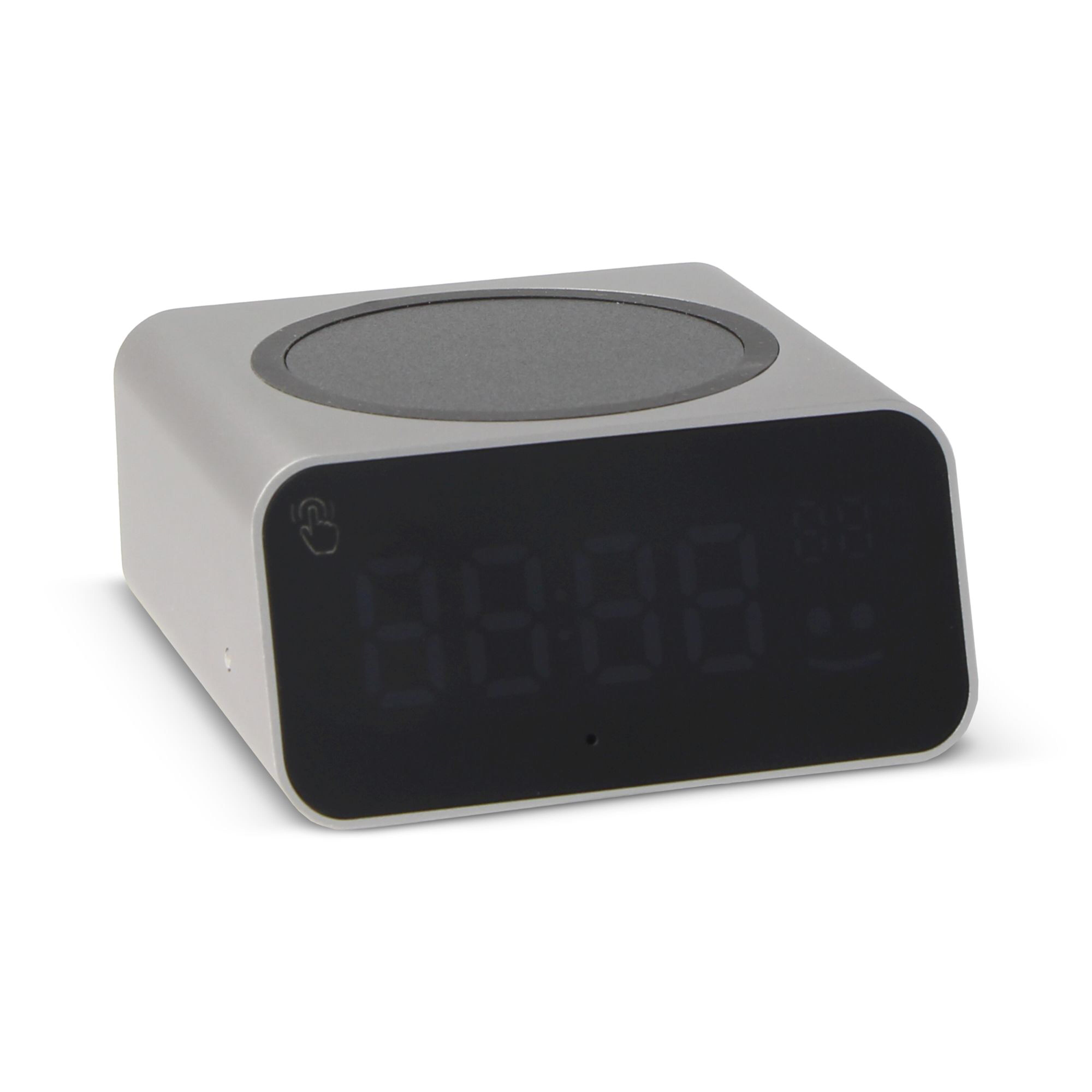 Erleben Sie Innovation! Unsere Uhr mit kabellosem Ladegerät, die aus recyceltem Aluminium gefertigt ist, liefert eine schnelle 15-W-Ladung. Das Smiley-Symbol leuchtet während des Schnellladevorgangs. Mit Temperaturüberwachung, automatischer Zeiteinstellung und einer Weckfunktion ist sie ein Meilenstein in Sachen Komfort und Nachhaltigkeit.