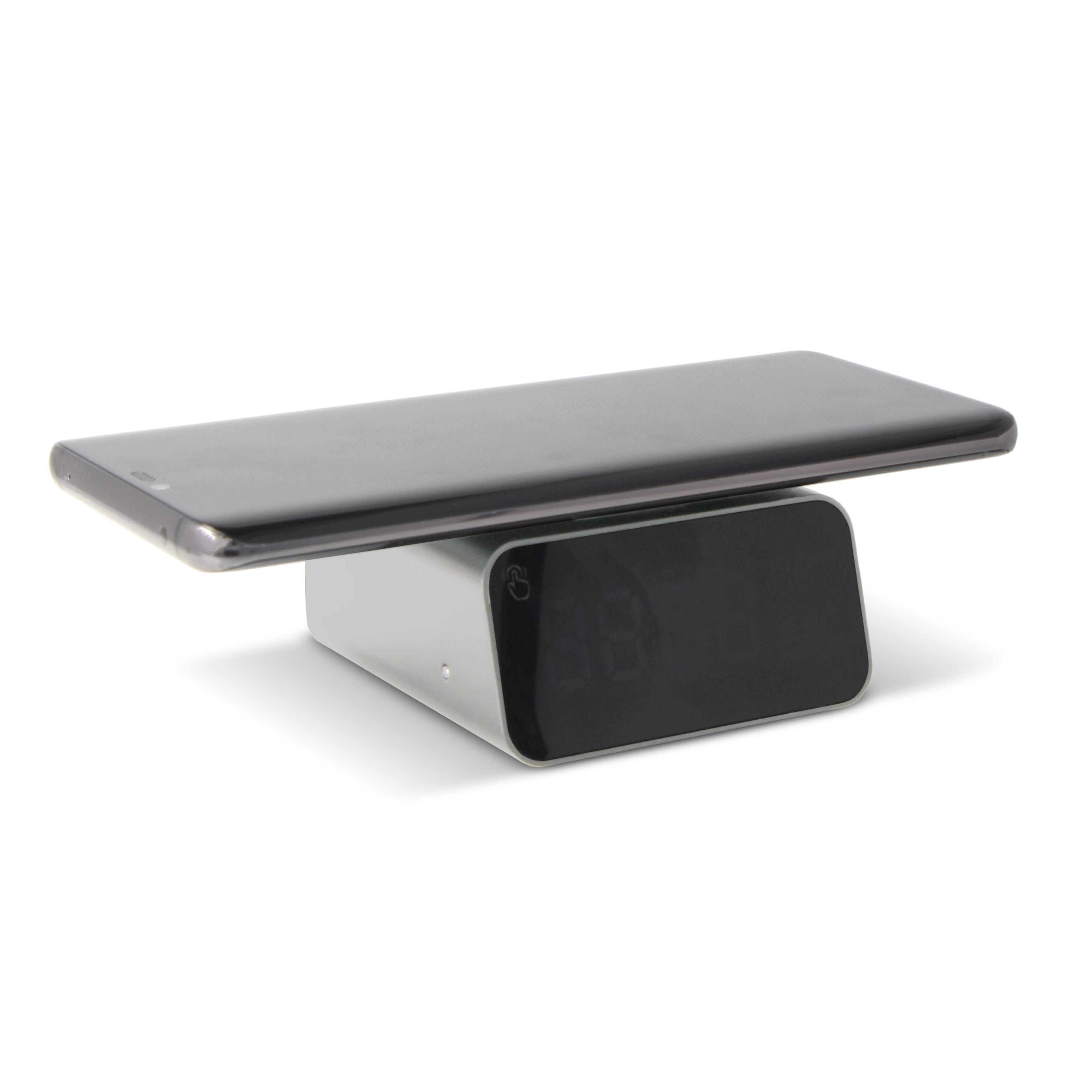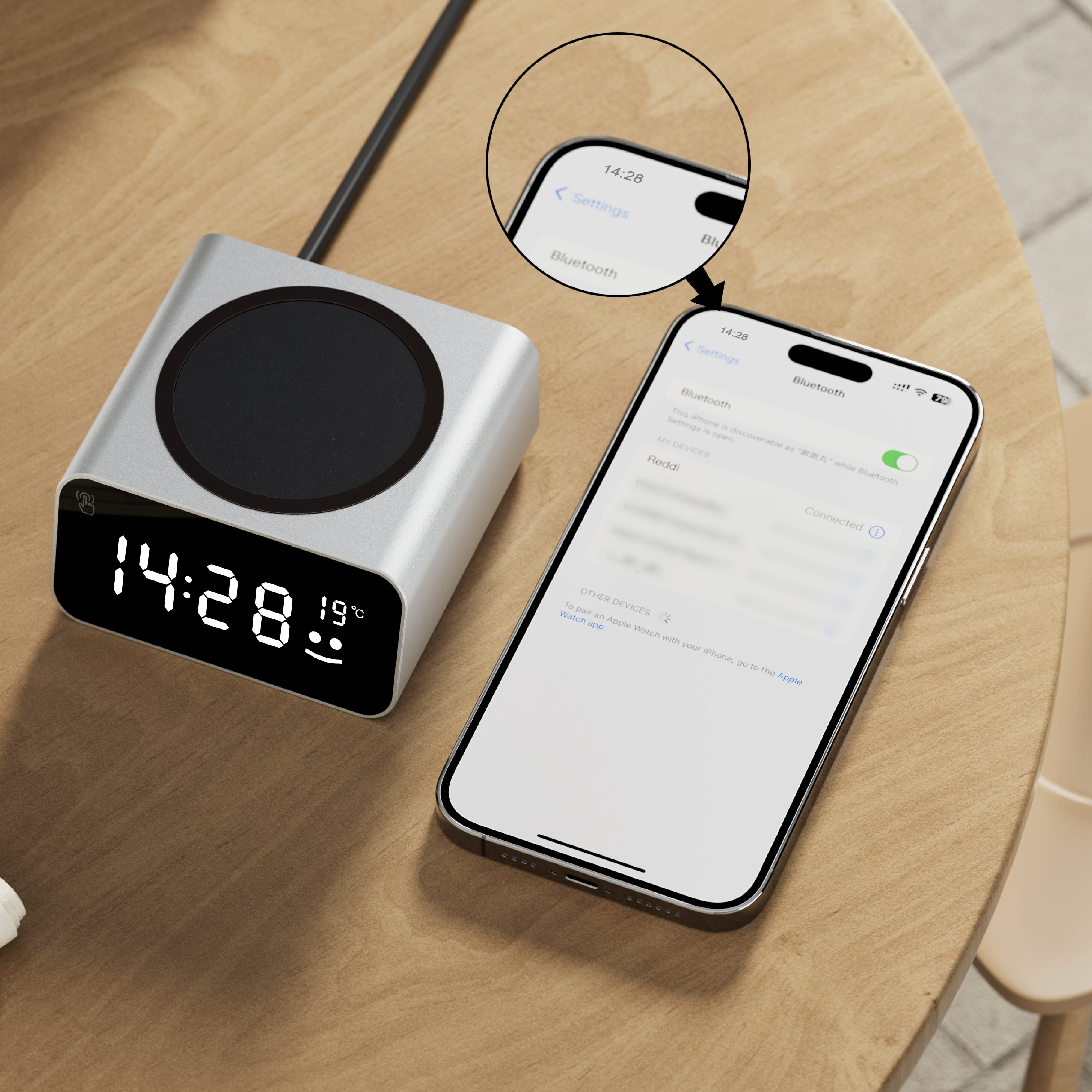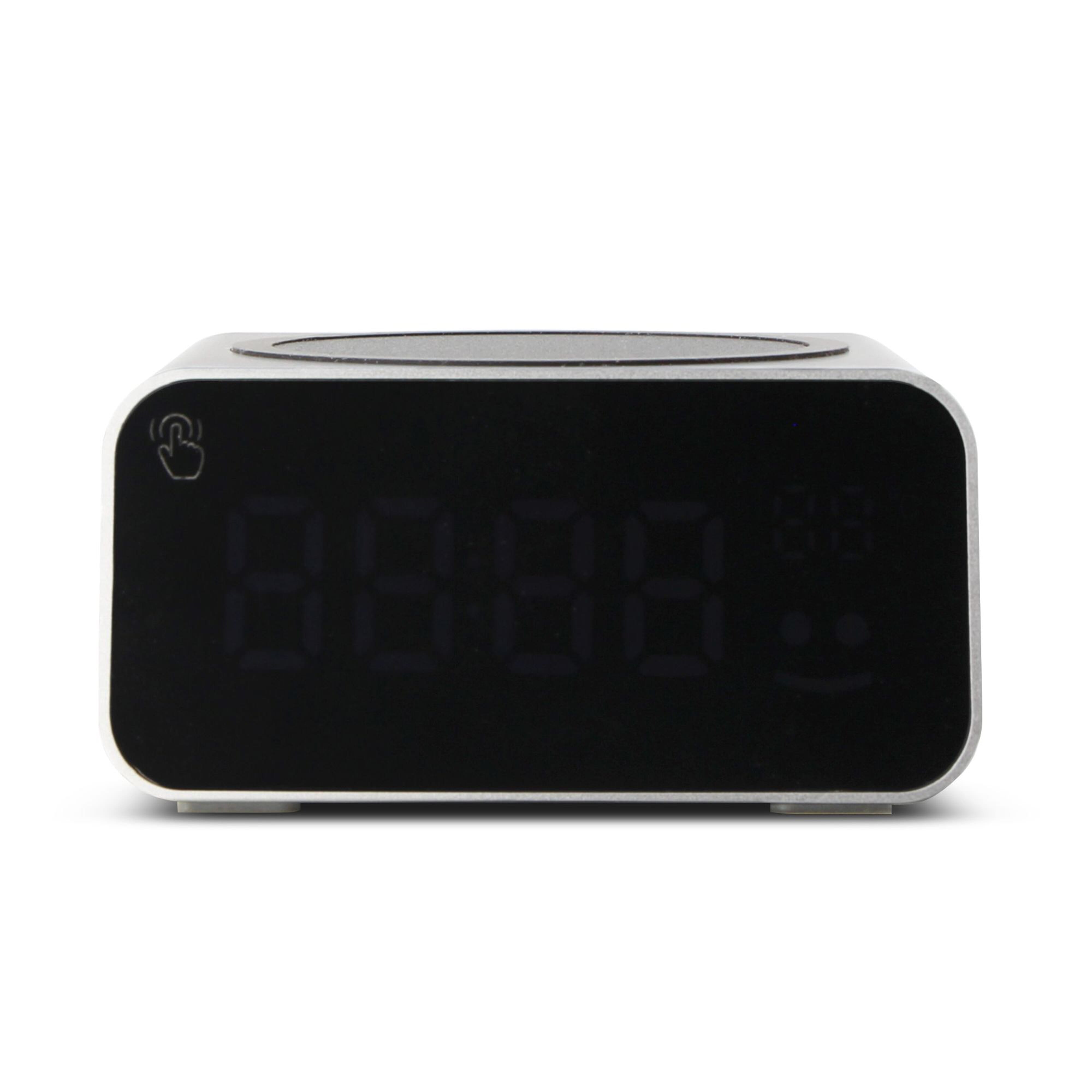 Erleben Sie Innovation! Unsere Uhr mit kabellosem Ladegerät, die aus recyceltem Aluminium gefertigt ist, liefert eine schnelle 15-W-Ladung. Das Smiley-Symbol leuchtet während des Schnellladevorgangs. Mit Temperaturüberwachung, automatischer Zeiteinstellung und einer Weckfunktion ist sie ein Meilenstein in Sachen Komfort und Nachhaltigkeit.