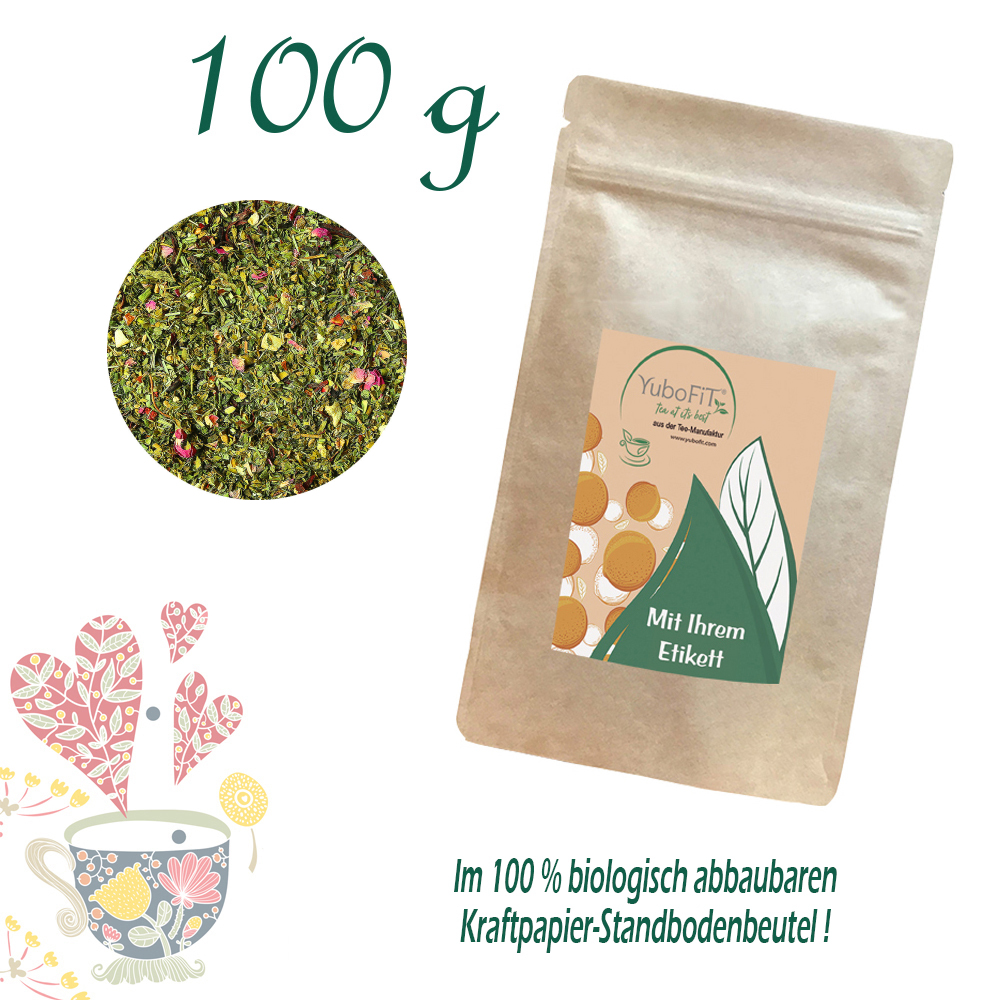 Marken-Tee aus der YuboFiT® Teemanufaktur. Artikelnummer: HLS991001-12 Verpackung: Standbodenbeutel Big, Kraftpapier, aluminiumfrei, Inhalt 100 g