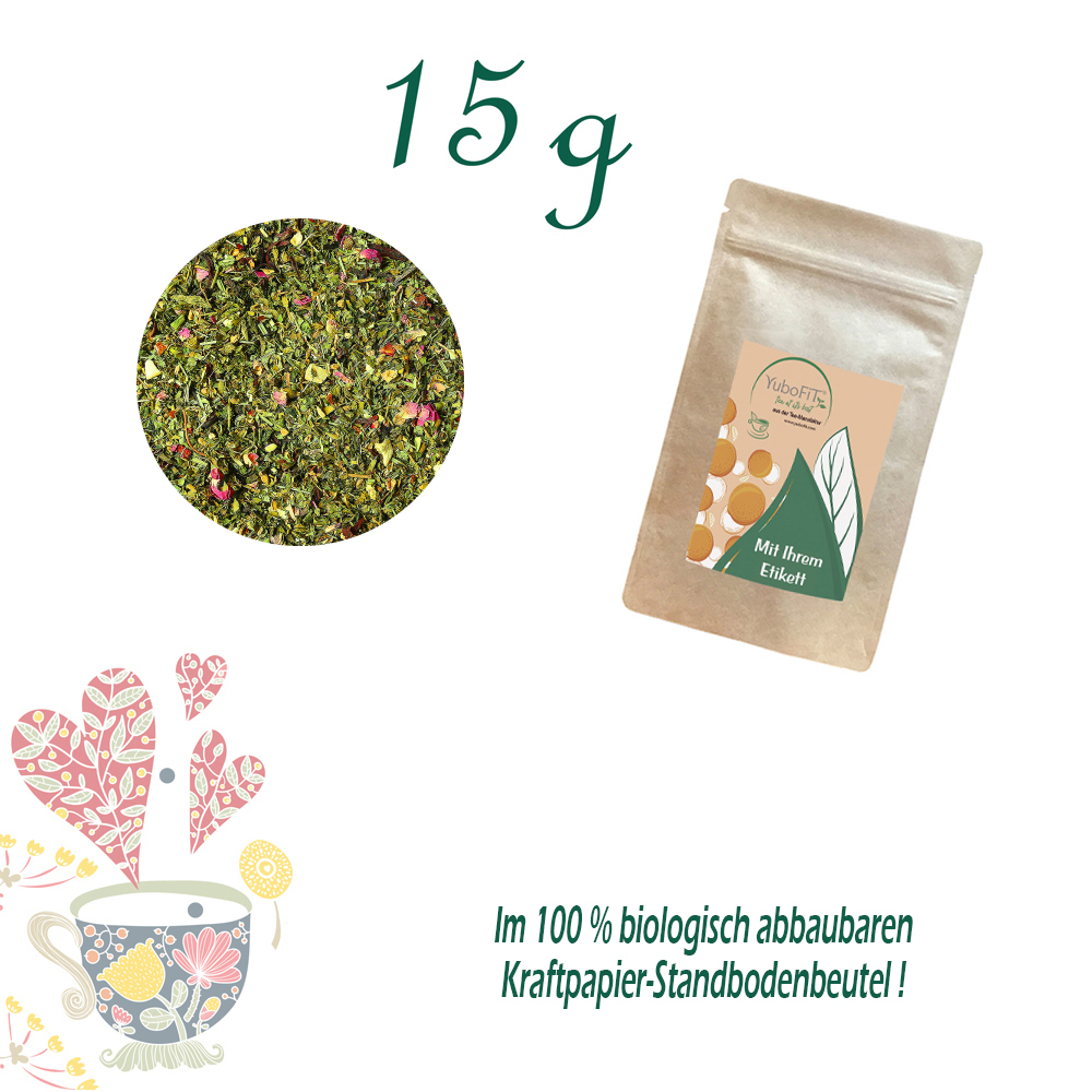 Marken-Tee aus der YuboFiT® Teemanufaktur. Artikelnummer: HLS991001-17 Verpackung: Standbodenbeutel Mini, Kraftpapier, Inhalt 15 g