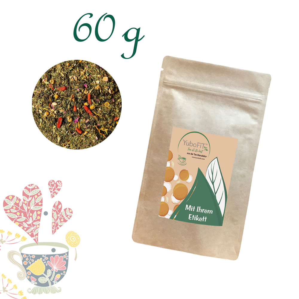 Marken-Tee aus der YuboFiT® Teemanufaktur. Artikelnummer: HLS991003-03 Verpackung: Standbodenbeutel Medium, Kraftpapier, aluminium, Inhalt 60 g