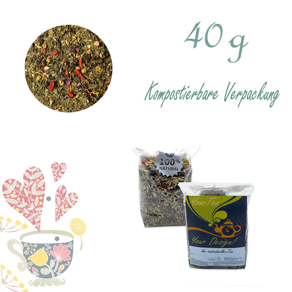 Marken-Tee aus der YuboFiT® Teemanufaktur. Artikelnummer: HLS991003-16 Verpackung: Kompostierbarer Zellglas-Beutel, Geprägtes Verschluss-Siegel aus Zuckerrohrpapier. Komplett abbaubar. Inhalt 40 g