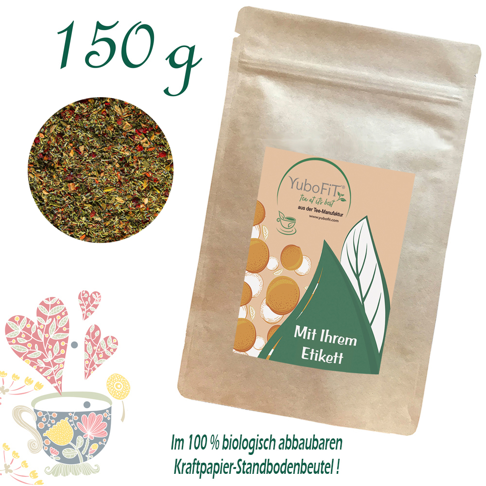 Markentee aus der YuboFiT® Tee-Manufaktur Marken-Tee aus der YuboFiT® Teemanufaktur. Artikelnummer: HLS991004-05 Verpackung: Standbodenbeutel Maxi, Kraftpapier, Inhalt 150 g