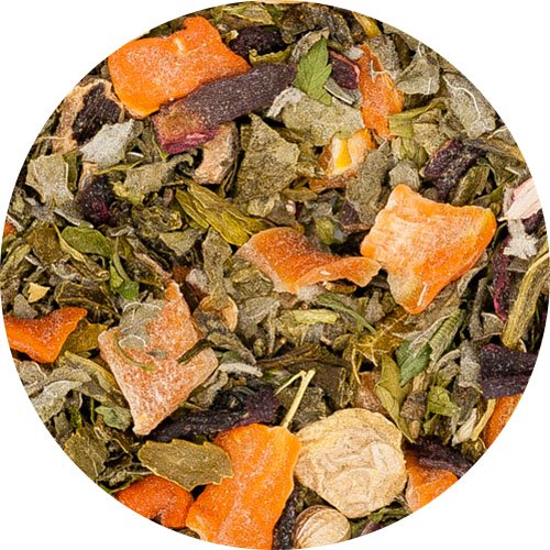 Grüner Tee Sencha* (20 %), Ingwer*, Karottenflocken*, weißer Hibiskus*, Apfelminze* (10 %), Johannisbrot*, Koriander*, Petersilie*(* Zutaten aus kontrolliert biologischem Anbau)