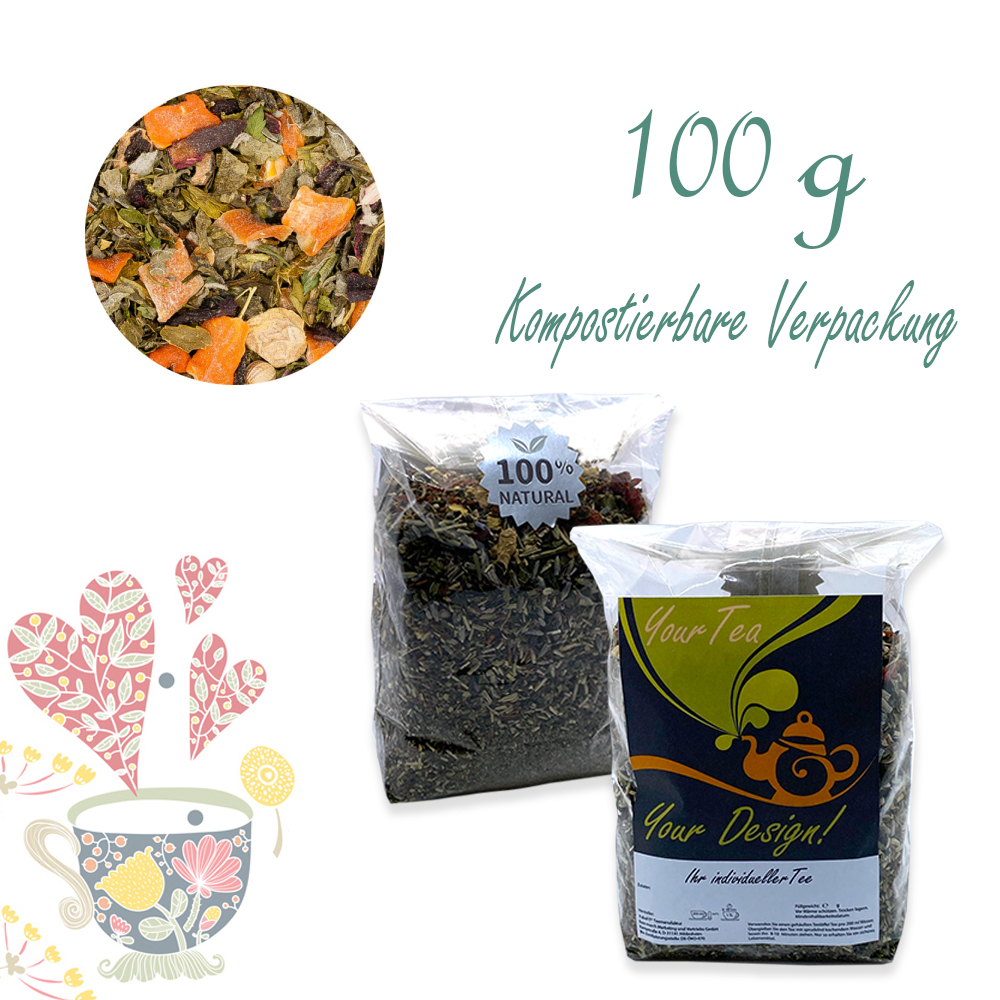 Grüner Tee Sencha* (20 %), Ingwer*, Karottenflocken*, weißer Hibiskus*, Apfelminze* (10 %), Johannisbrot*, Koriander*, Petersilie*(* Zutaten aus kontrolliert biologischem Anbau)