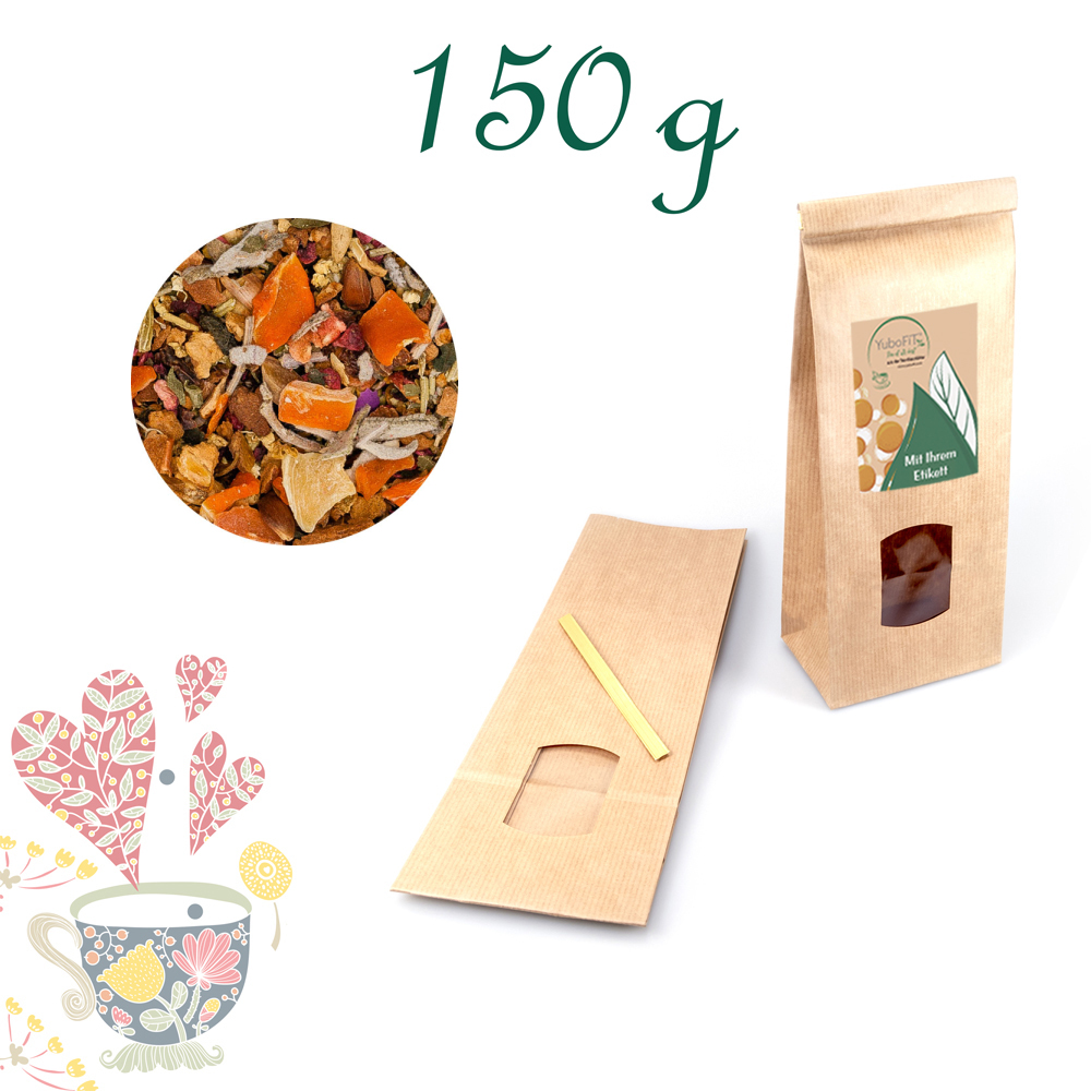 Apfelstücke*, Karottenflocken*, Hibiskus*, Salbeiblätter*, Rosmarin*, Brennnesselblätter*, Holunderblüten*, Himbeerstücke*, Blaubeeren*, Granatapfelkerne*, Rosenblütenblätter*, Erdbeeren*(* Zutaten aus kontrolliert biologischem Anbau)