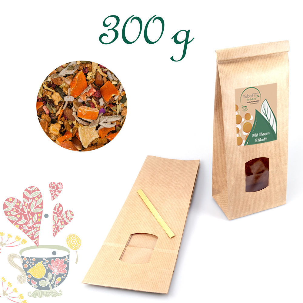 Apfelstücke*, Karottenflocken*, Hibiskus*, Salbeiblätter*, Rosmarin*, Brennnesselblätter*, Holunderblüten*, Himbeerstücke*, Blaubeeren*, Granatapfelkerne*, Rosenblütenblätter*, Erdbeeren*(* Zutaten aus kontrolliert biologischem Anbau)