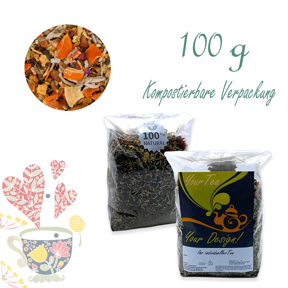 Apfelstücke*, Karottenflocken*, Hibiskus*, Salbeiblätter*, Rosmarin*, Brennnesselblätter*, Holunderblüten*, Himbeerstücke*, Blaubeeren*, Granatapfelkerne*, Rosenblütenblätter*, Erdbeeren*(* Zutaten aus kontrolliert biologischem Anbau)