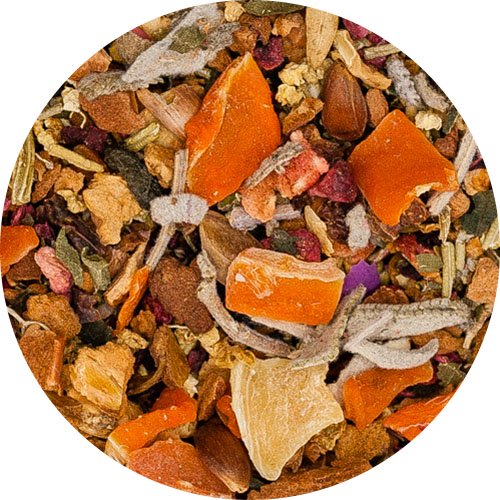 Apfelstücke*, Karottenflocken*, Hibiskus*, Salbeiblätter*, Rosmarin*, Brennnesselblätter*, Holunderblüten*, Himbeerstücke*, Blaubeeren*, Granatapfelkerne*, Rosenblütenblätter*, Erdbeeren*(* Zutaten aus kontrolliert biologischem Anbau)
