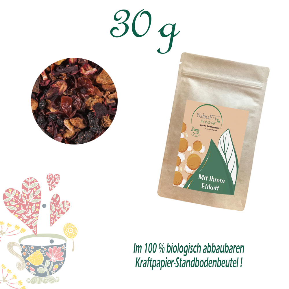 Hibiskusblüten*, Hagebuttenschalen*, Apfelstücke*, Holunderbeeren*, Orangenschalen*, natürliches Aroma(* Zutaten aus kontrolliert biologischem Anbau)