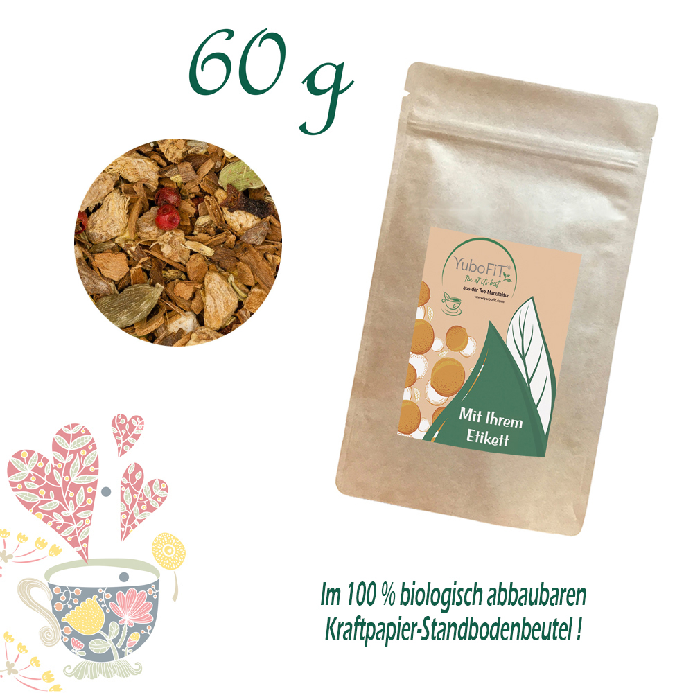 Zimt* (39 %), Ingwer*, Kardamom*, Süßholzwurzel (8 %)*, Fenchel*, Anis*, Gewürznelken*, Orangenschalen*, rosa Pfeffer*, Bockshornkleesamen*, Orangenöl*(* Zutaten aus kontrolliert biologischem Anbau)
