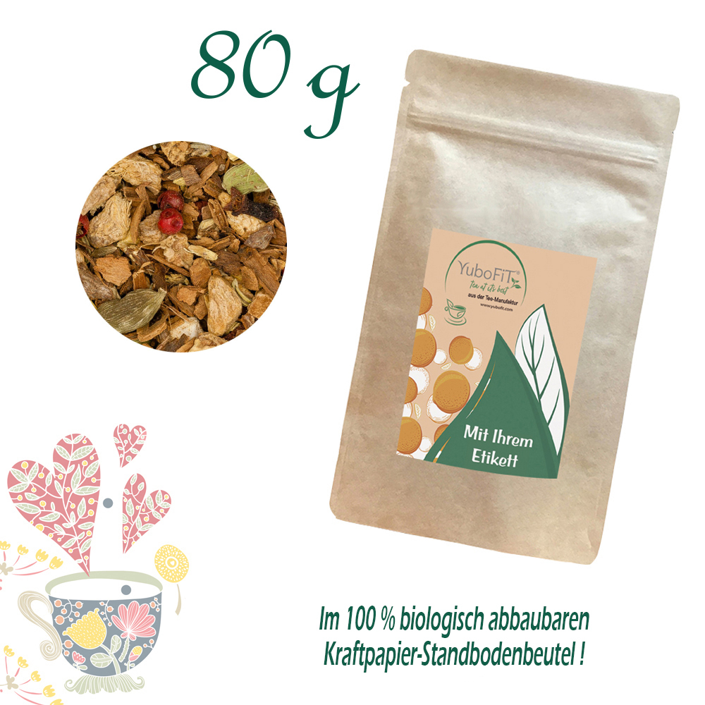 Zimt* (39 %), Ingwer*, Kardamom*, Süßholzwurzel (8 %)*, Fenchel*, Anis*, Gewürznelken*, Orangenschalen*, rosa Pfeffer*, Bockshornkleesamen*, Orangenöl*(* Zutaten aus kontrolliert biologischem Anbau)