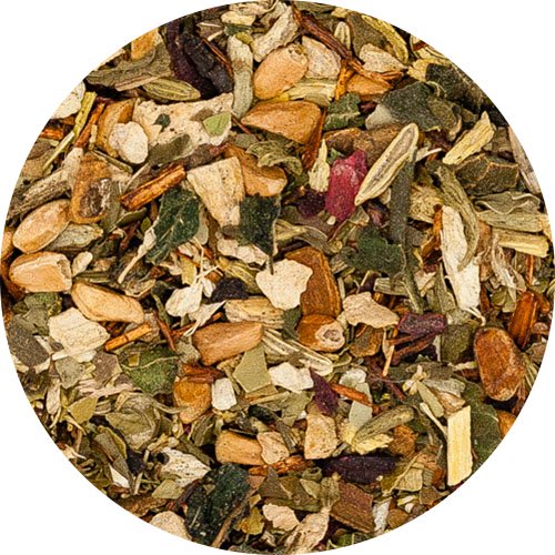 Hagebuttenkerne*, Mate* (13 %), Ingwer*, Rooibos*, Fenchel*, Krauseminze*, Süßholzwurzel*, Zimt*, Hibiskus*, Brennnesselblätter*, Kamille*, Kardamomsaat*, Löwenzahnwurzel*, Aromen, Spirulina* (1 %)(* Zutaten aus kontrolliert biologischem Anbau)
