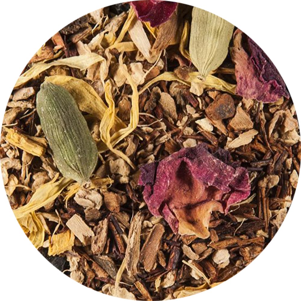 Ingwer*, Rooibos*, Zimt*, Süßholzwurzel*, schwarzer Pfeffer*, Aromen, Kardamomschoten*, Rosenblütenblätter*, Ringelblumenblüten* (* Zutaten aus kontrolliert biologischem Anbau) Enthält Süßholzwurzel - bei hohem Blutdruck sollte ein übermäßiger Verzehr dieses Erzeugnisses vermieden werden.
