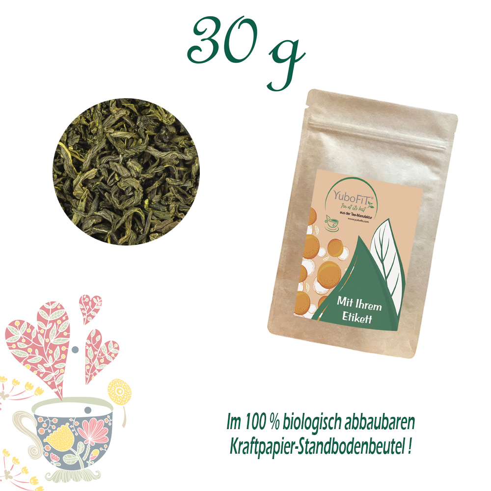 Dieser Tee hat recht große und gedrehte, jadegrüne Blätter. Er hat einen leichten, frischen Geschmack mit einem Hauch von Süße und eine klare gelbe Tassenfarbe. Ein besonderer Genuss für Grüntee-Liebhaber.