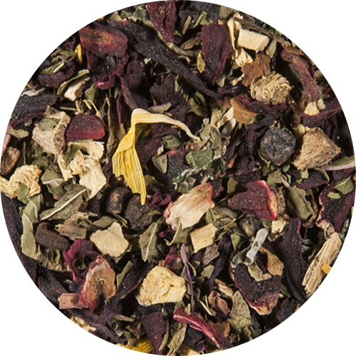 Hibiskusblüten*, Süßholzwurzel*, Pfefferminze* (17,5 %), Himbeerblätter*, Gewürznelken*, Zimt*, Kardamomsaat*, schwarzer Pfeffer*, Ingwer*, Ringelblumenblüten*(*Zutaten aus kontrolliert biologischem Anbau) Enthält Süßholzwurzel - bei Bluthochdruck sollte ein übermäßiger Verzehr dieses Erzeugnisses vermieden werden.