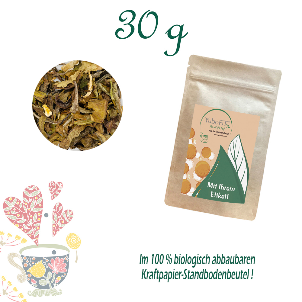 Die filigranen Orangenblüten und das feine Orangenöl dieser Weißtee-Komposition laden zu einem gedanklichen Spaziergang durch einen duftenden Orangenhain ein.